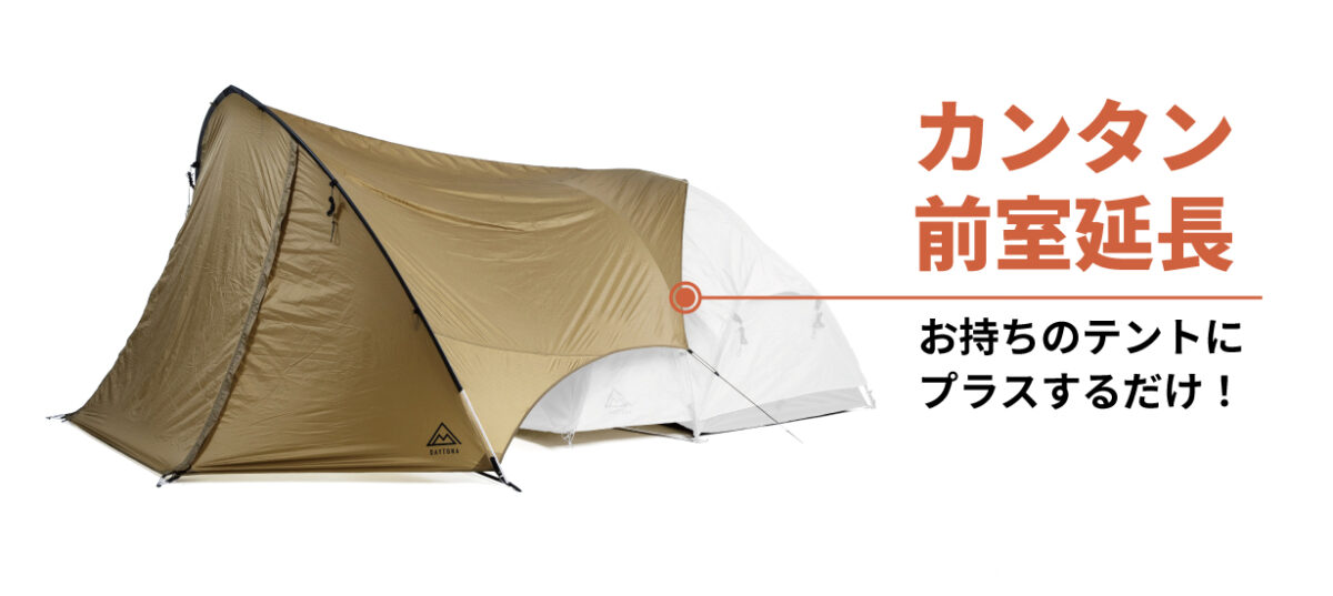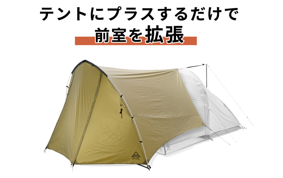 デイトナのテントにジャストフィット。お手持ちのテントに後付けするだけで大型の前室が出現。単独での使用も可。軽量コンパクトな設計で荷物を増やしたくないツーリングキャンパーにおすすめなシェルターです
