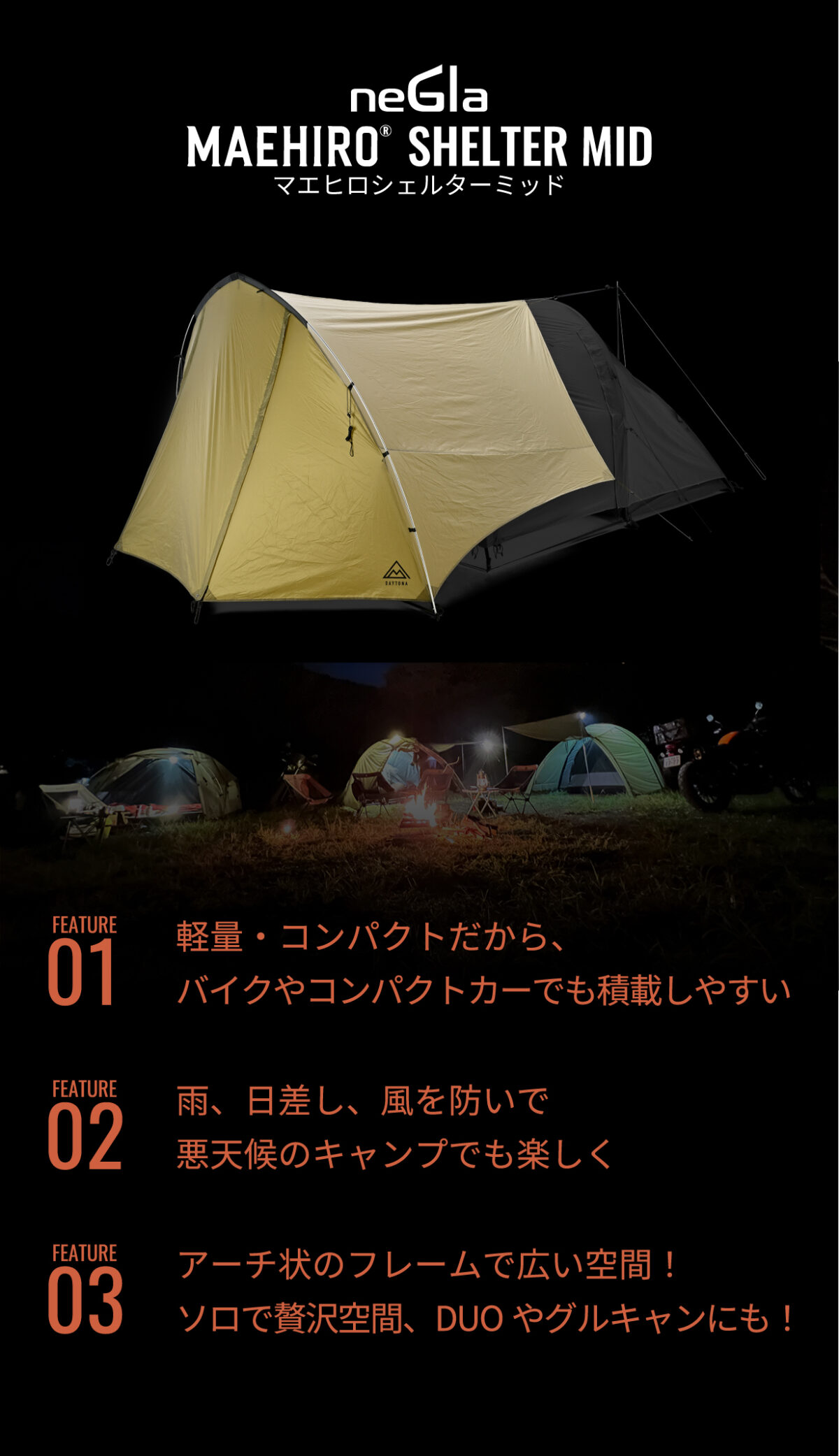 好評のマエヒロシェルターに新たなサイズが仲間入り!原付収納もOK!大型テントに対応した“MID”でソロサイトに広大な前室空間をプラス