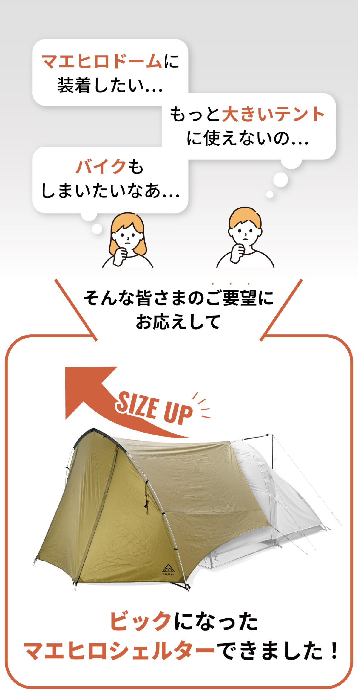 コンパクトなテントで室内空間が制約されてしまい不便な思いをされているライダー達にもっとキャンプを楽しんで欲しい!そんな思いから生まれたのが『マエヒロシェルター』です。