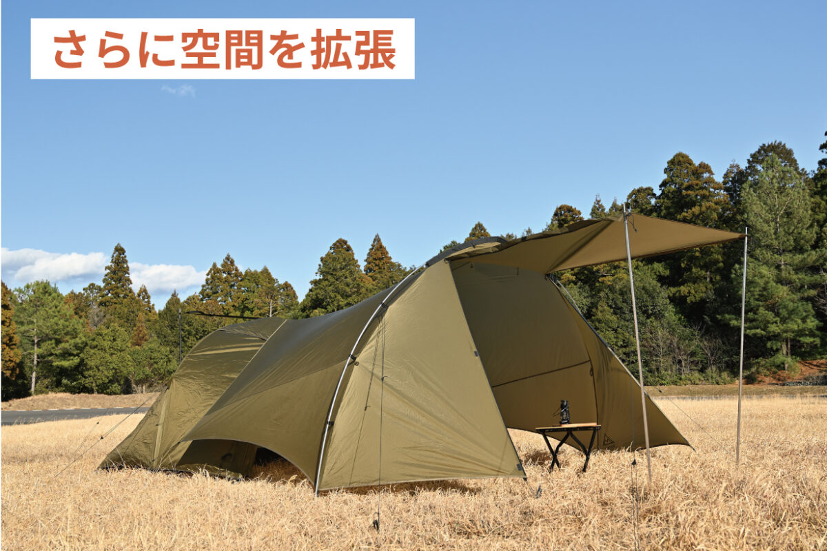 お手持ちのテントにプラスするだけでファミリーテントのような広大なリビングスペースをつくることができます。※高さ95~150cm、幅220cmまでのテントに適合します。