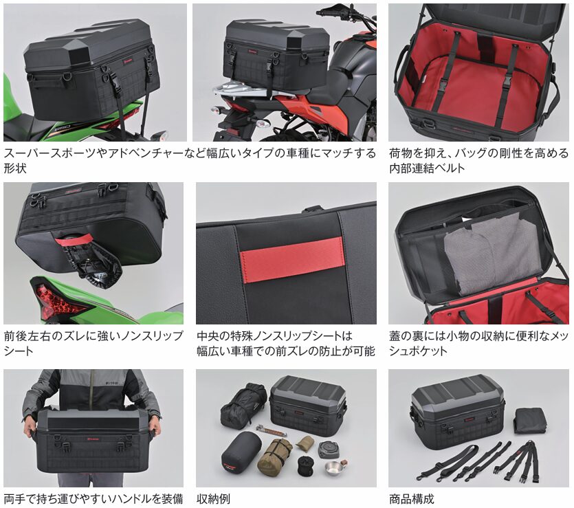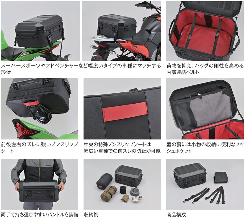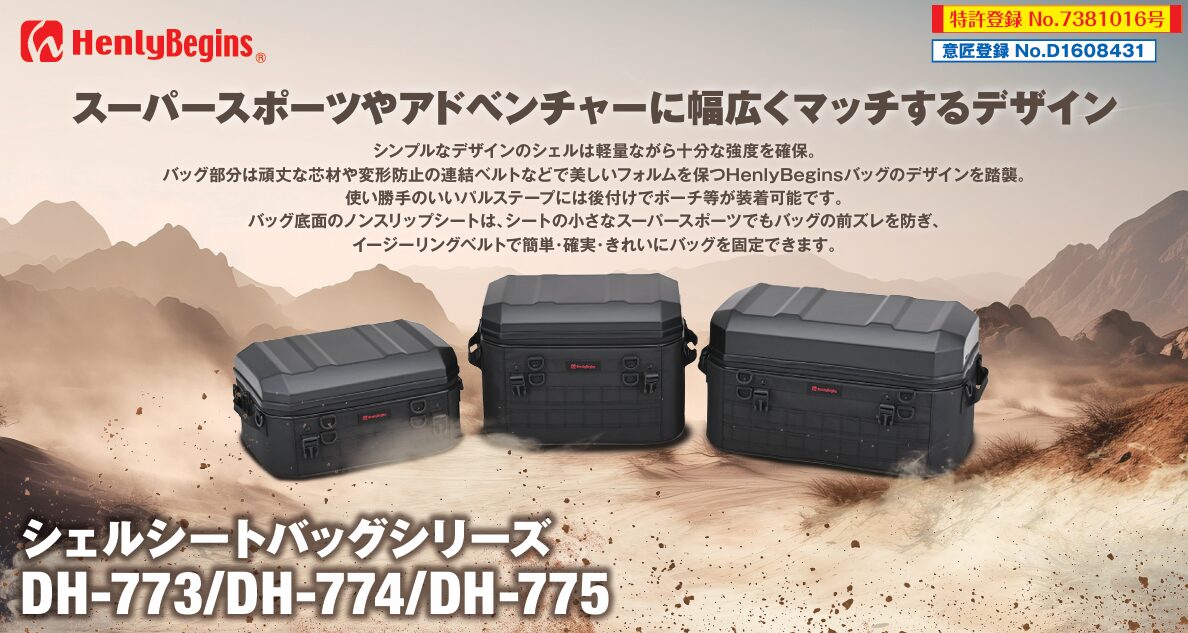 同製品は、軽量ながら十分な強度を確保し、バッグ部分は頑丈な芯材や変形防止の連結ベルトなどで美しいフォルムを保つHenlyBeginsバッグのデザインを踏襲しているのが特徴だ。気軽に使える日帰り~1泊サイズの「DH-773」と、日常使い~連泊ツーリングにも対応する「DH-774」、容量たっぷり45ℓタイプの「DH-775」の3種類をラインアップしている。また、いずれもブラックとカーボンの2色展開である。