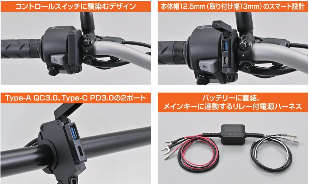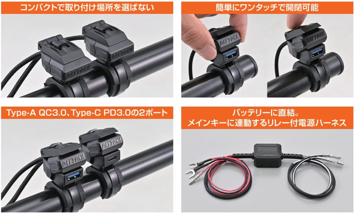 株式会社デイトナは、2タイプのバイク専用USB電源 Type-A+Type-Cを発売した。