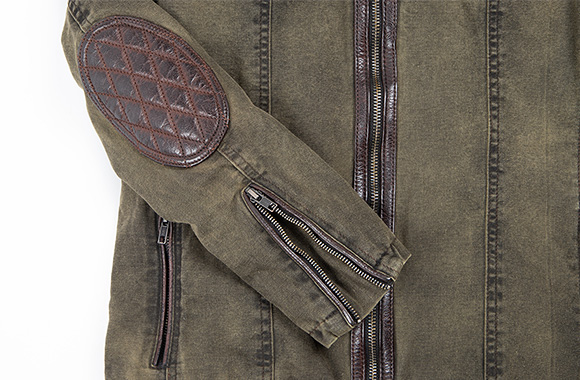 肘の牛革はデザインのアクセントだけでなく、転倒時の備えにも。