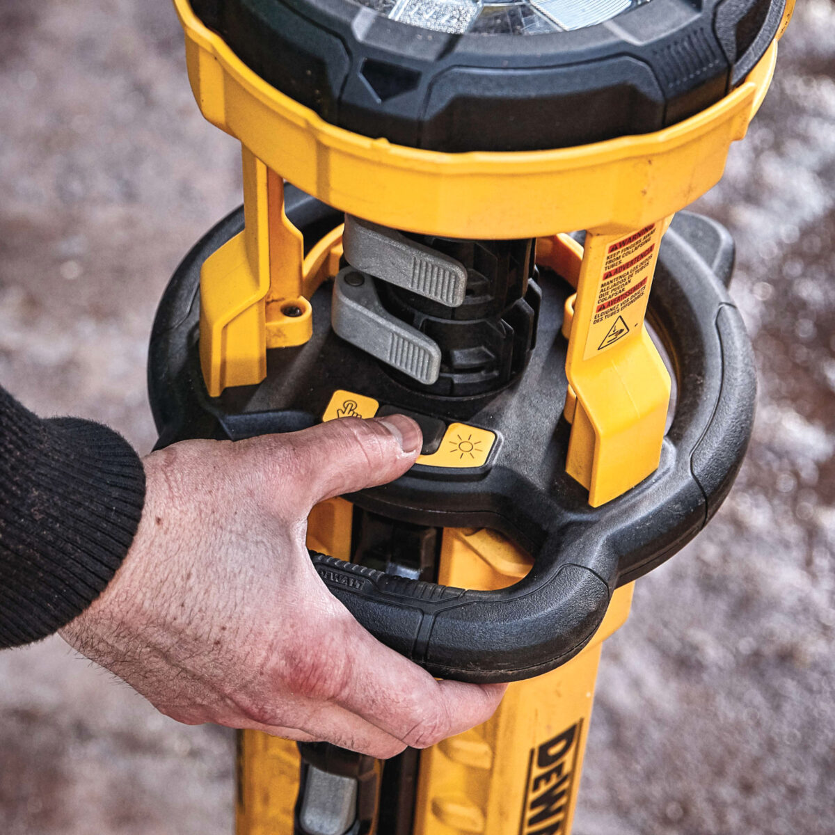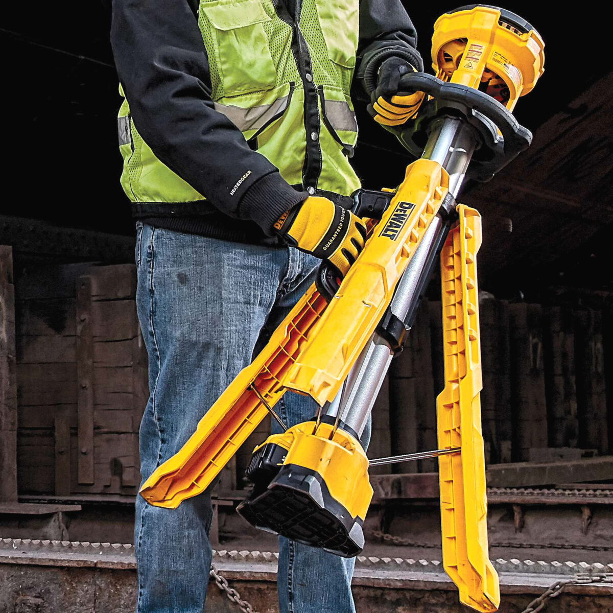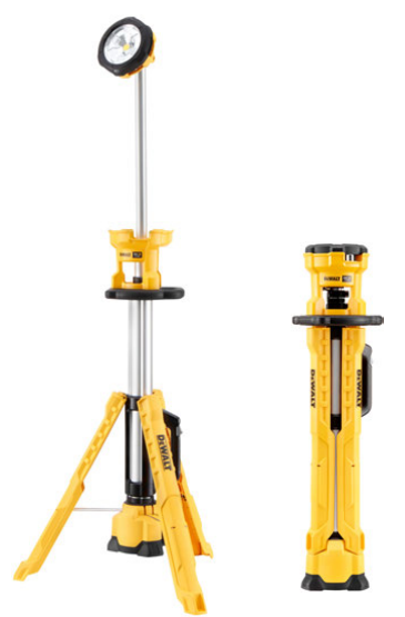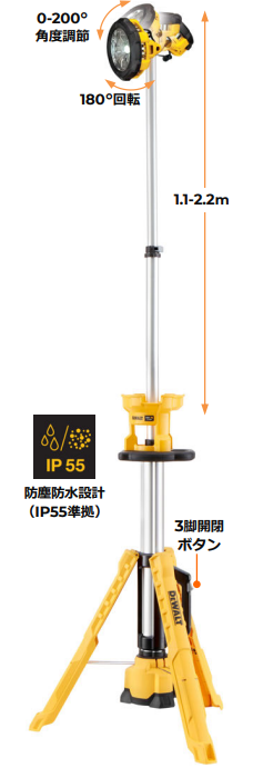 本製品は、DEWALT 18Vシリーズの電動⼯具など15種類(注1)と共通の着脱式バッテリーシステムを採⽤。クラス最⾼⽔準の4000ルーメンのLEDライトを備え、⾼さは1.1mから2.2mまで伸縮、照射⾓度は左右180°・上下200°⾃在に調節できます。また3脚部分はワンタッチで⼿早く組み⽴てられるほか、⽚⼿で持ち運びやすい重⼼設計や⼤型ハンドルも備えています。さらに、IP55準拠による優れた防じん・防⽔性、3段階の照度調節機能などを備えます。