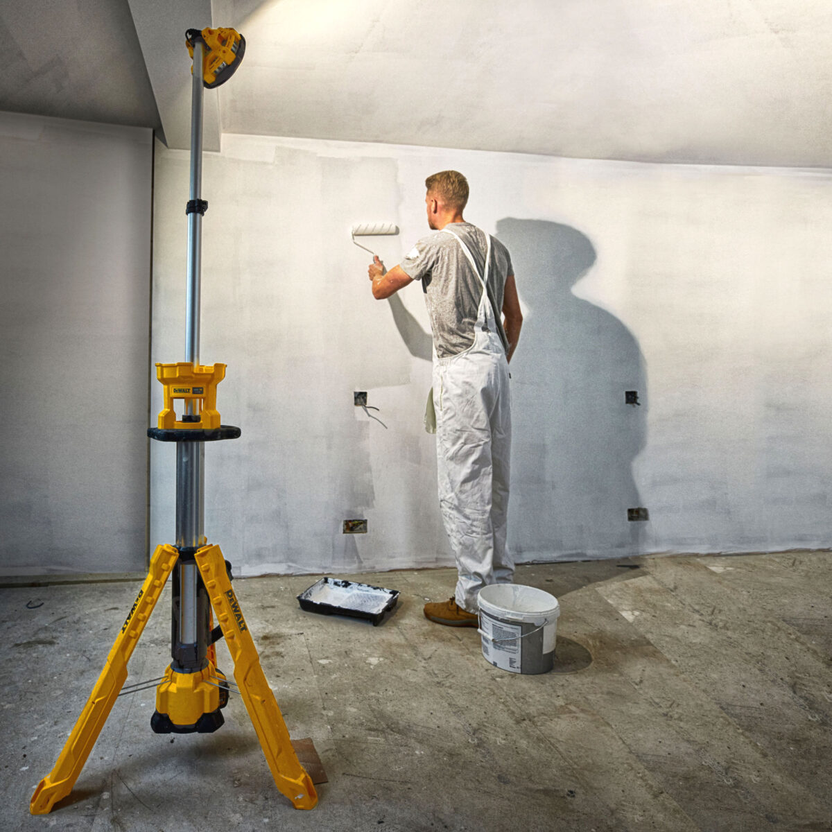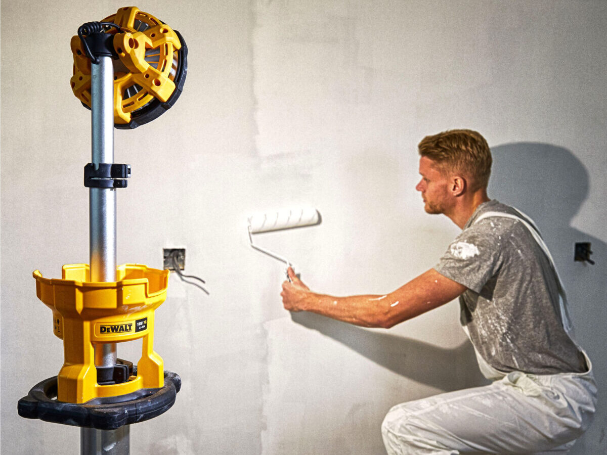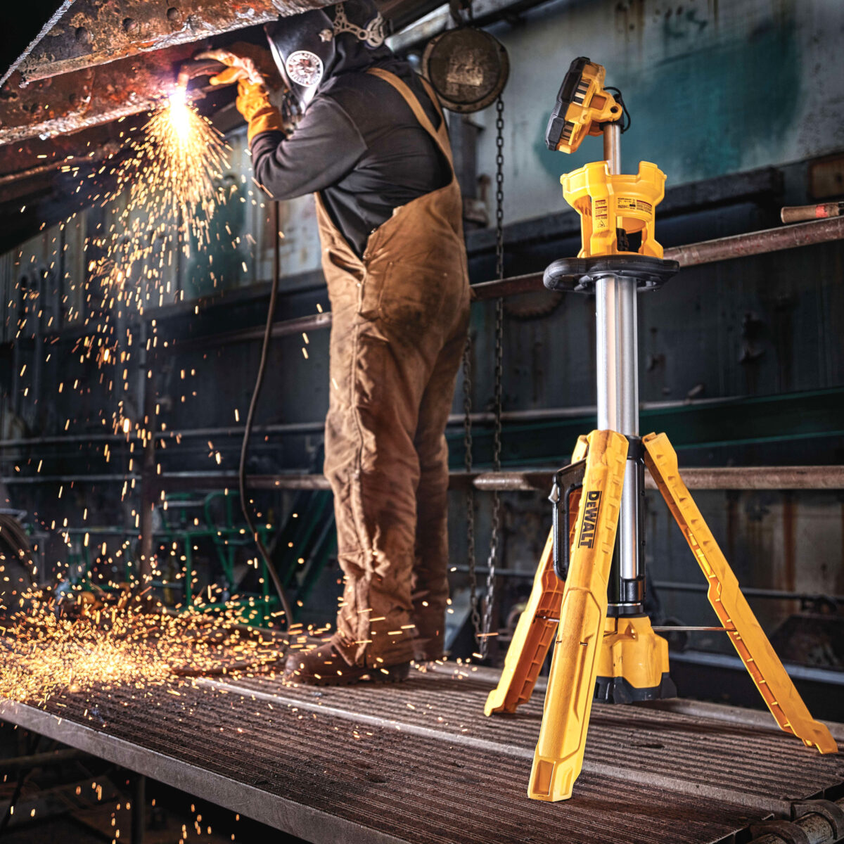 本製品は、DEWALT 18Vシリーズの電動⼯具など15種類(注1)と共通の着脱式バッテリーシステムを採⽤。クラス最⾼⽔準の4000ルーメンのLEDライトを備え、⾼さは1.1mから2.2mまで伸縮、照射⾓度は左右180°・上下200°⾃在に調節できます。また3脚部分はワンタッチで⼿早く組み⽴てられるほか、⽚⼿で持ち運びやすい重⼼設計や⼤型ハンドルも備えています。さらに、IP55準拠による優れた防じん・防⽔性、3段階の照度調節機能などを備えます。
