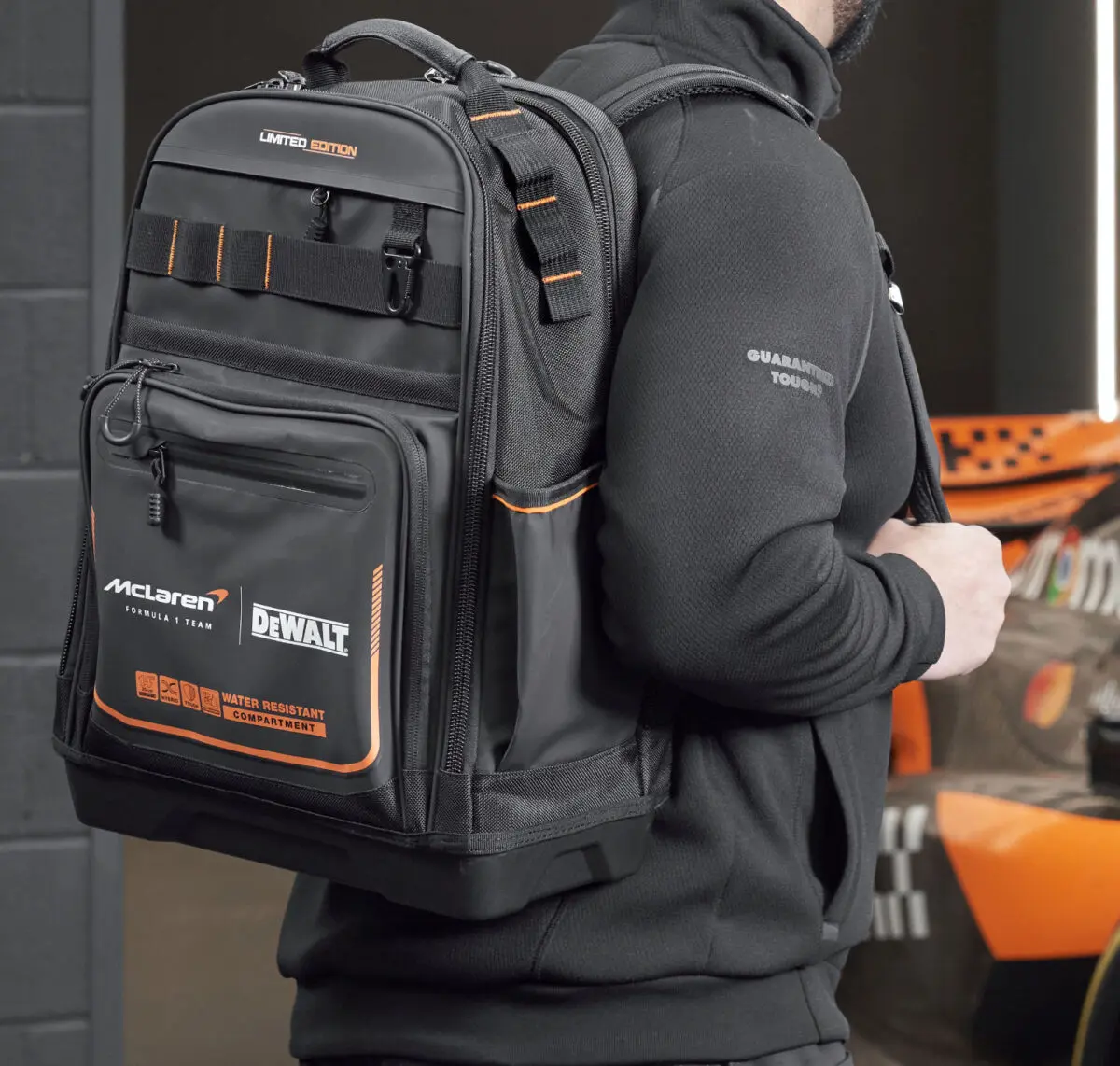 オフィシャルツール&ストレージパートナーとの特別コラボデザイン︕タフネスと⾼い収納⼒…⼯具ブランドならではの機能性「DEWALT×McLaren F1チーム バックパック/⾓型バッグ」