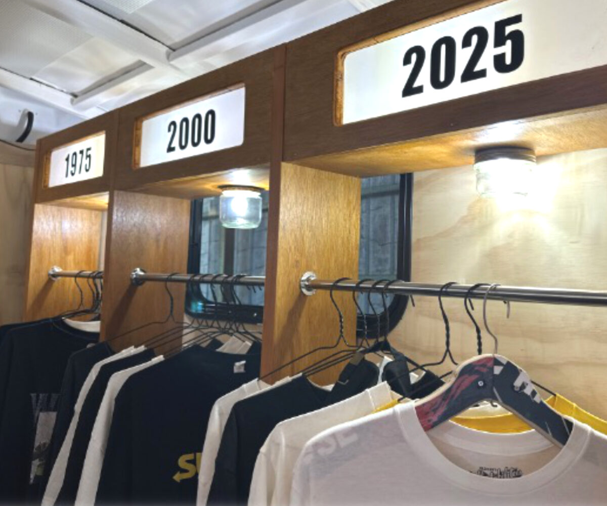 また古着をアップサイクルしたブランドヒストリーの限定デザインTシャツや特別仕様のネオンクロックなど、ブランドイメージを体現するアメリカンテイストあふれる内装を施しています。