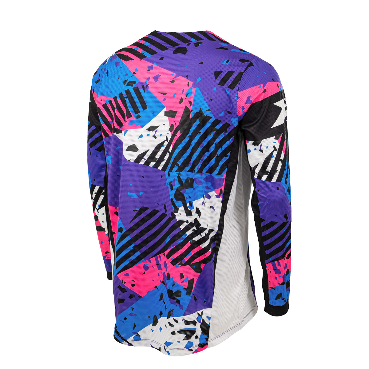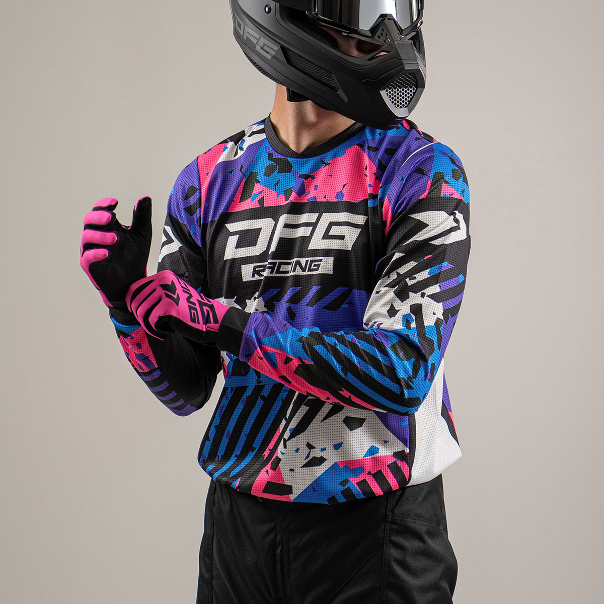 オフロードライディングに必要な基本性能を押さえ、コストパフォーマンスに優れたスタンダードモトクロスジャージ。インナープロテクターに対応した余裕のあるデザインで、練習走行からサンデーレースまで幅広く対応。