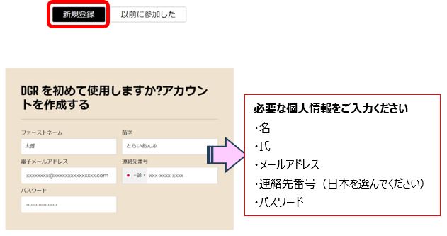 1:DGR 公式サイトから【登録する】を選択し、DGR への登録を進めてください。