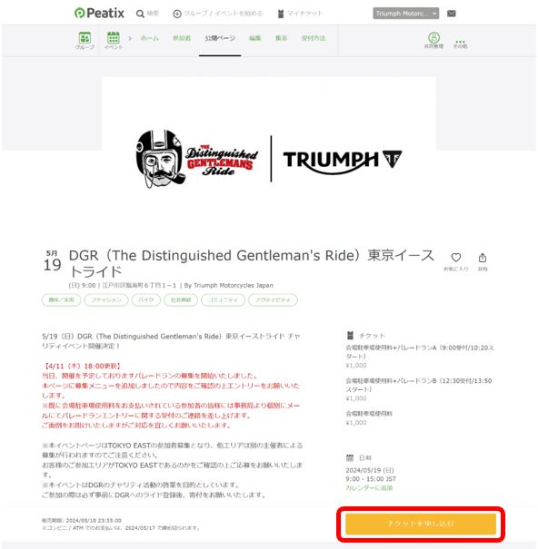 9:5/19 の東京イーストライドに実際に参加される方は、以下のオンラインチケットサービス Peatix にアクセスし、https://dgrtokyoeastride.peatix.com/view の東京イーストライドへの【チケットを申込む】を実行して参加申込をしてください。