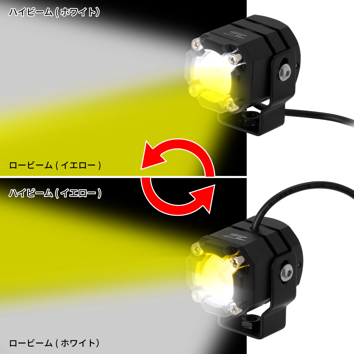 ボディを反転させることで、ロービーム(イエロー)/ハイビーム(ホワイト)を反転できる。 自由度の高い車種専用マウントは、照射方向を上下左右に調整可能。
