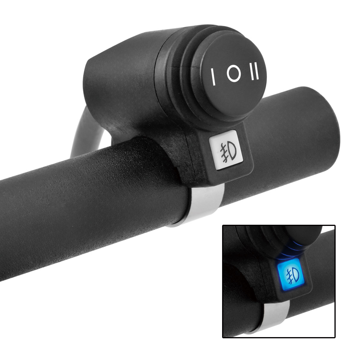 高輝度LEDユニットは1500ルーメンの明るさと、1個15Wの省電力仕様。 また、手元のスイッチでハイビーム(ホワイト)/ロービーム(イエロー)を切替可能なため、対向車とのすれ違いにも対応。オンオフスイッチ付き。