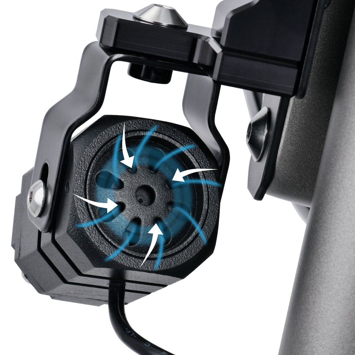 堅牢性と放熱性に優れるアルミニウムボディを採用。 更に高温時には、冷却ファンが作動することで、ユニットの破損と輝度低下を防ぐ。