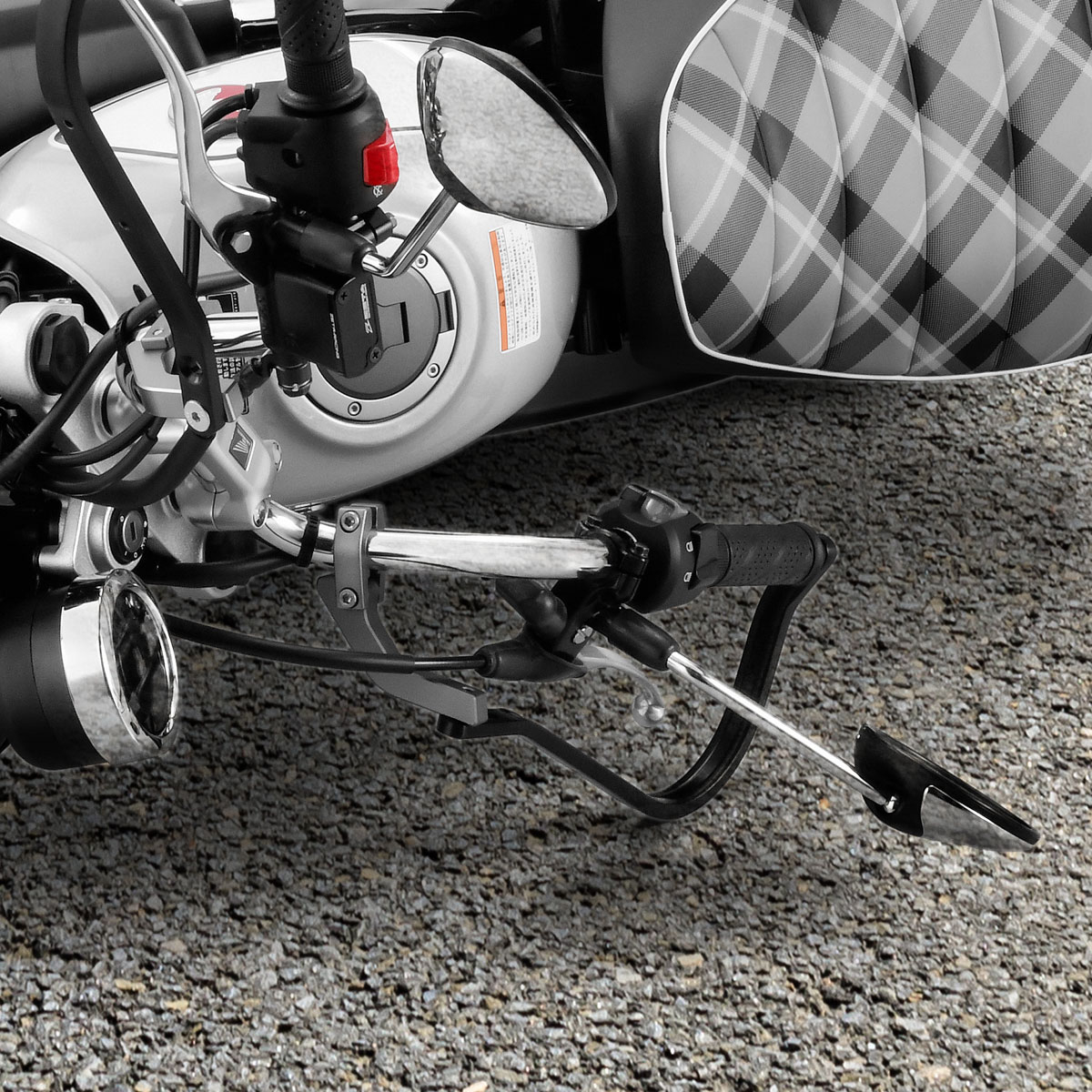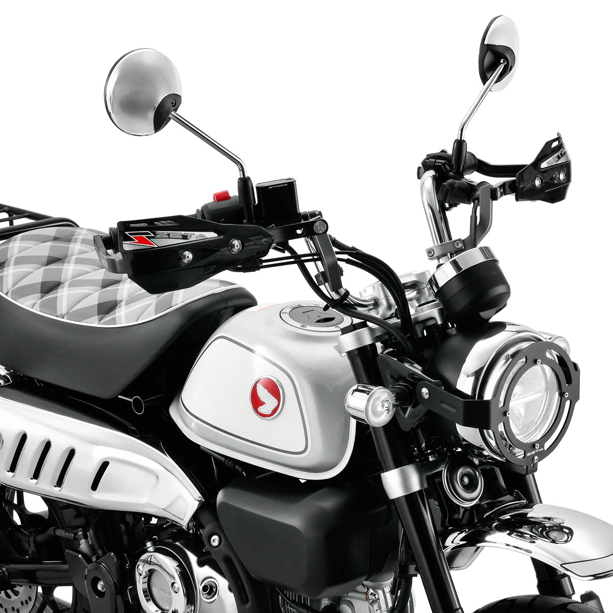モンキー125用に専用設計されたアルミニウムハンドガード。オフロード走行にも耐えうる高強度アルミニウム合金を採用。ハンドルクランプを専用形状とすることで、ワイヤー類の干渉を回避。