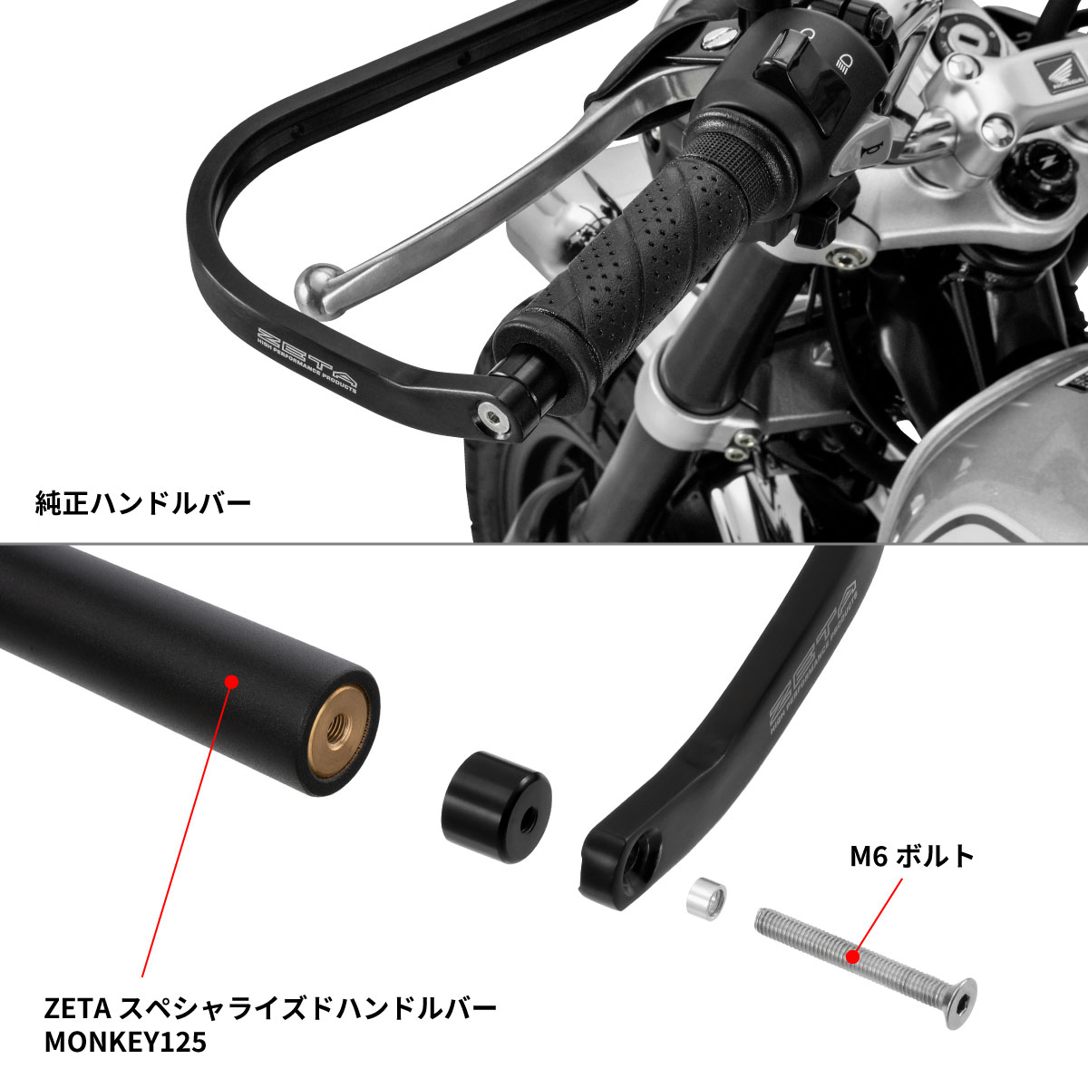 ハンドルエンドの固定はM6ボルトを採用し、純正ハンドルバーとZETA RACINGスペシャライズドハンドルバーにボルトオン装着。