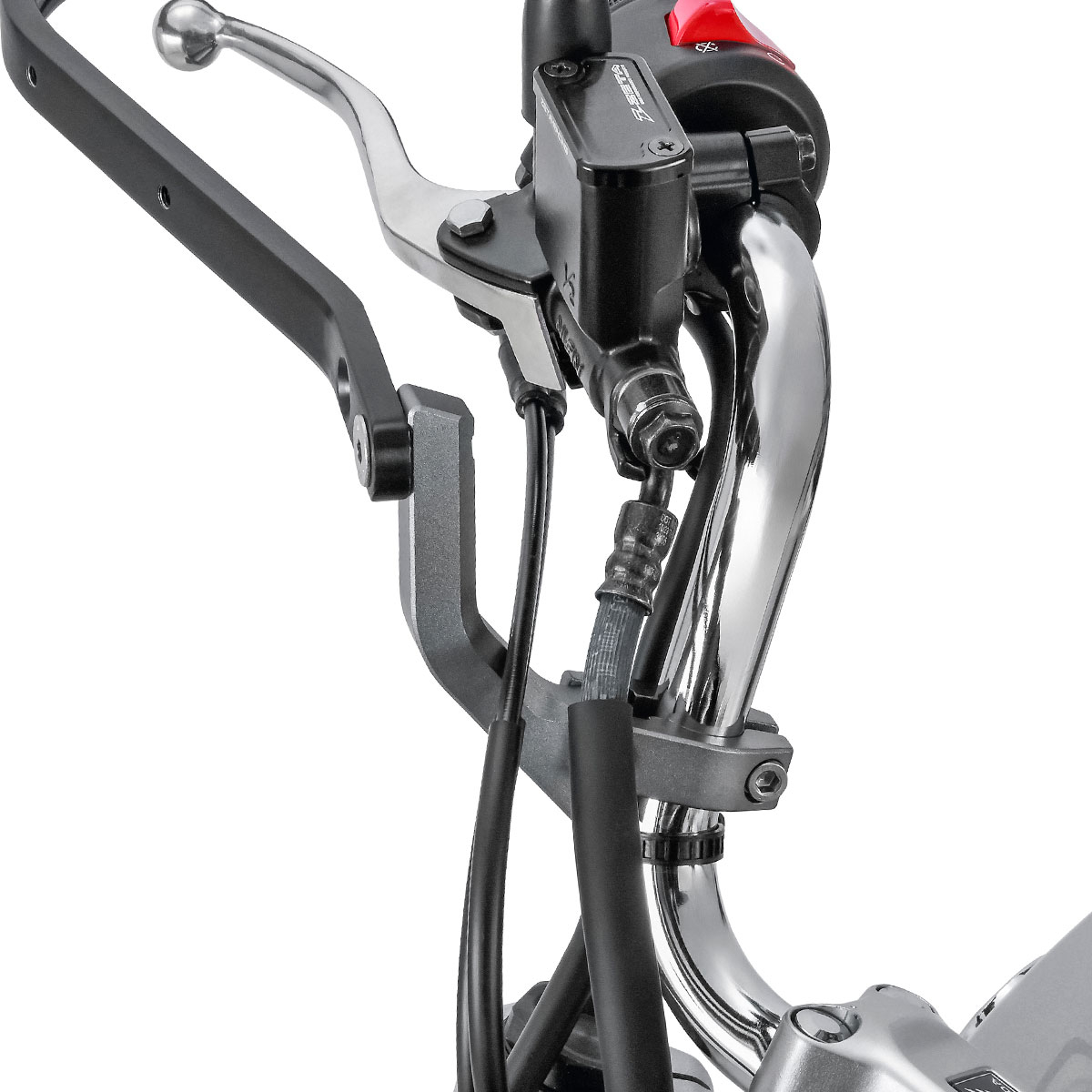 ハンドルクランプを専用形状にすることで、ブレーキホースやワイヤー類の干渉を回避して固定が可能。