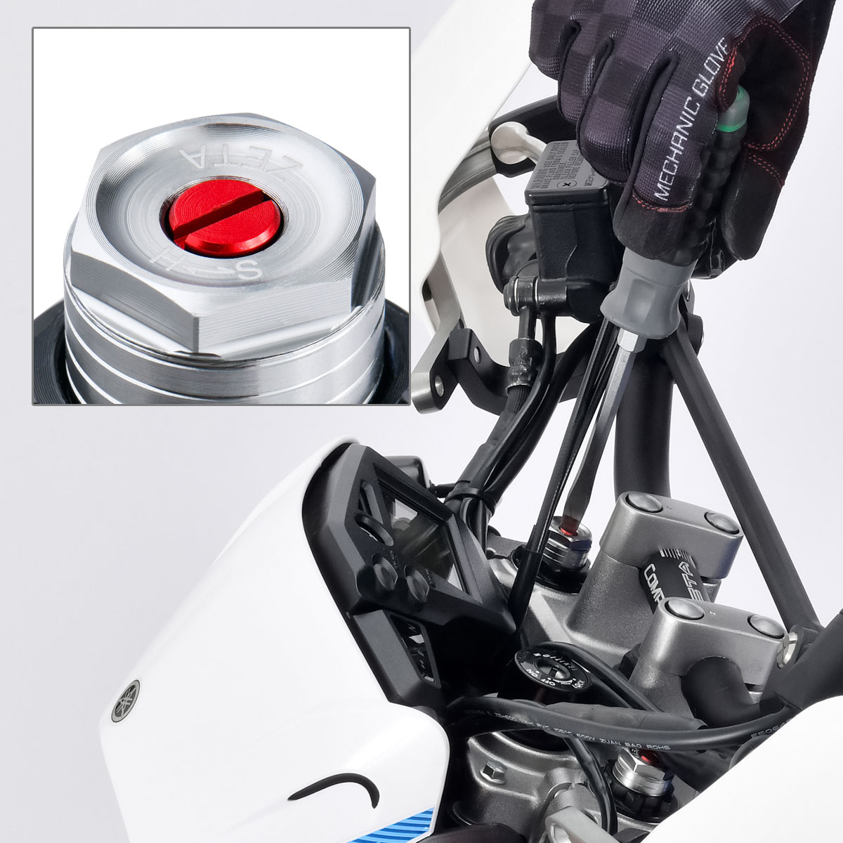 フロントスプリングの反力を調整できるイニシャルアジャスター付きトップキャップ。プリロードをかけることで、フロント周りのカッチリ感が増し、ブレーキングからコーナリングの安定性が向上する。ツーリングなどでの荷物を積んだ際にも効果を発揮。また、エアバルブスクリューを装備したことで、フォーク内の圧力を大気圧にリセットすることができる。