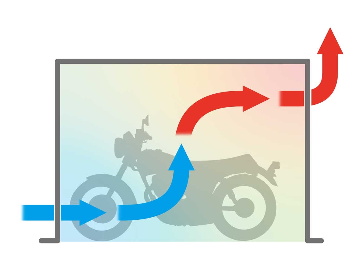 本体には上下で高低差のある換気口を設け、重力による空気の流れでガレージ内のこもりを軽減。さらに、面ファスナー付きの長めのフラップにより、雨の日でも下向きに開く構造となっており、換気と防水性を両立している。