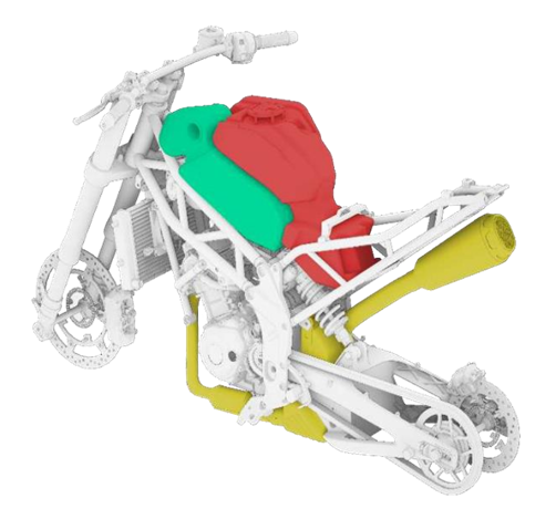 ステルスのシャシーは、クロモリ鋼パイプをトラス状に組み合わせて作りだされる堅牢なメインフレームに、ファンティック・ストリートモデルのアイデンティティ伴っているアルミ削り出しのフレーム・プレート(スイングアームピボット&ステッププレート)を組み合わせたコンパクトな設計だ。エアボックスを前に、燃料タンクを中央に配置し、マスを集中化させることで振り回して楽しいマシン特性に仕上げ、ファンティックらしい操る喜びにあふれるマシンへとまとめ上げた。MM125エンジンとの組み合わせは、このクラスのマシンを求めるマジョリティである若者層ばかりか、スモールクラスならではの操作感に期待するベテラン層にも十分以上に楽しんでいただけるものとなっている。