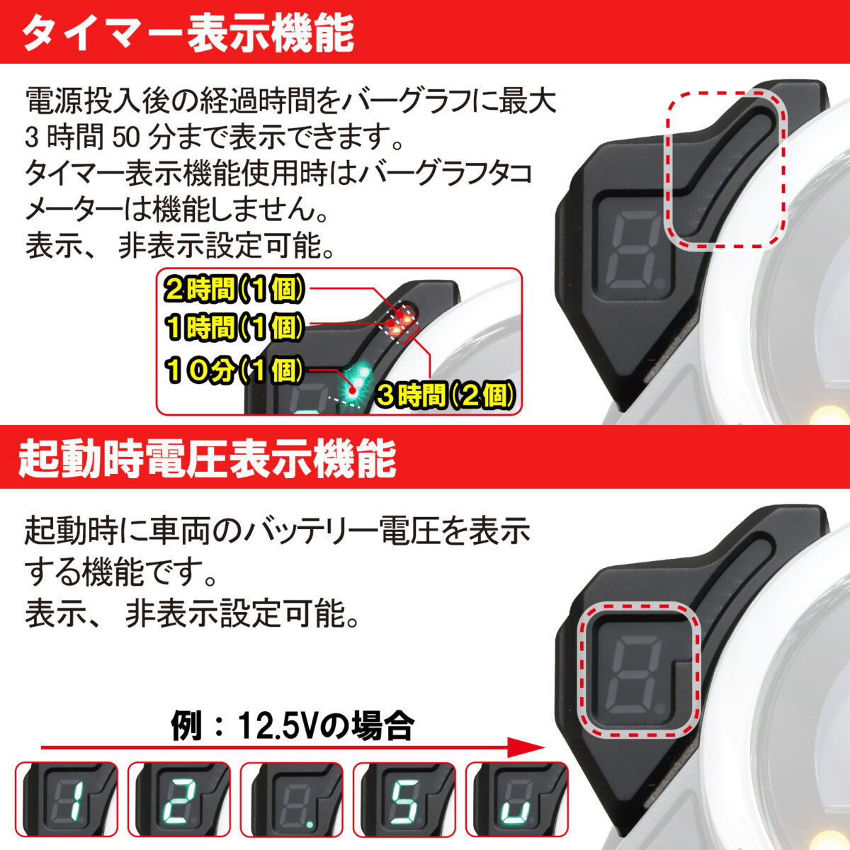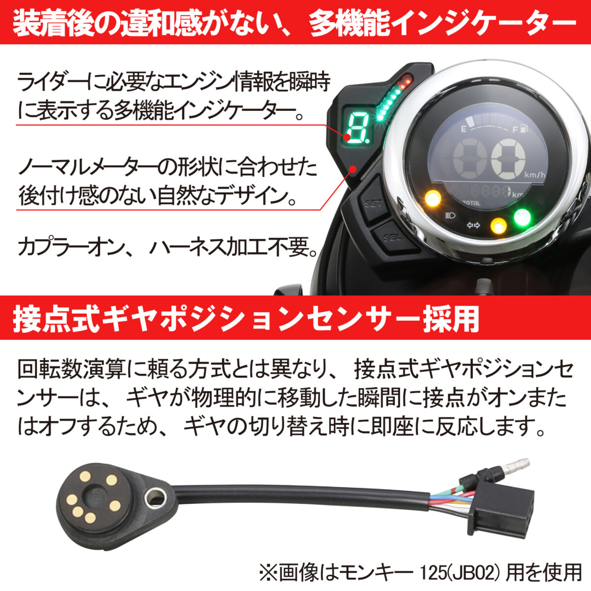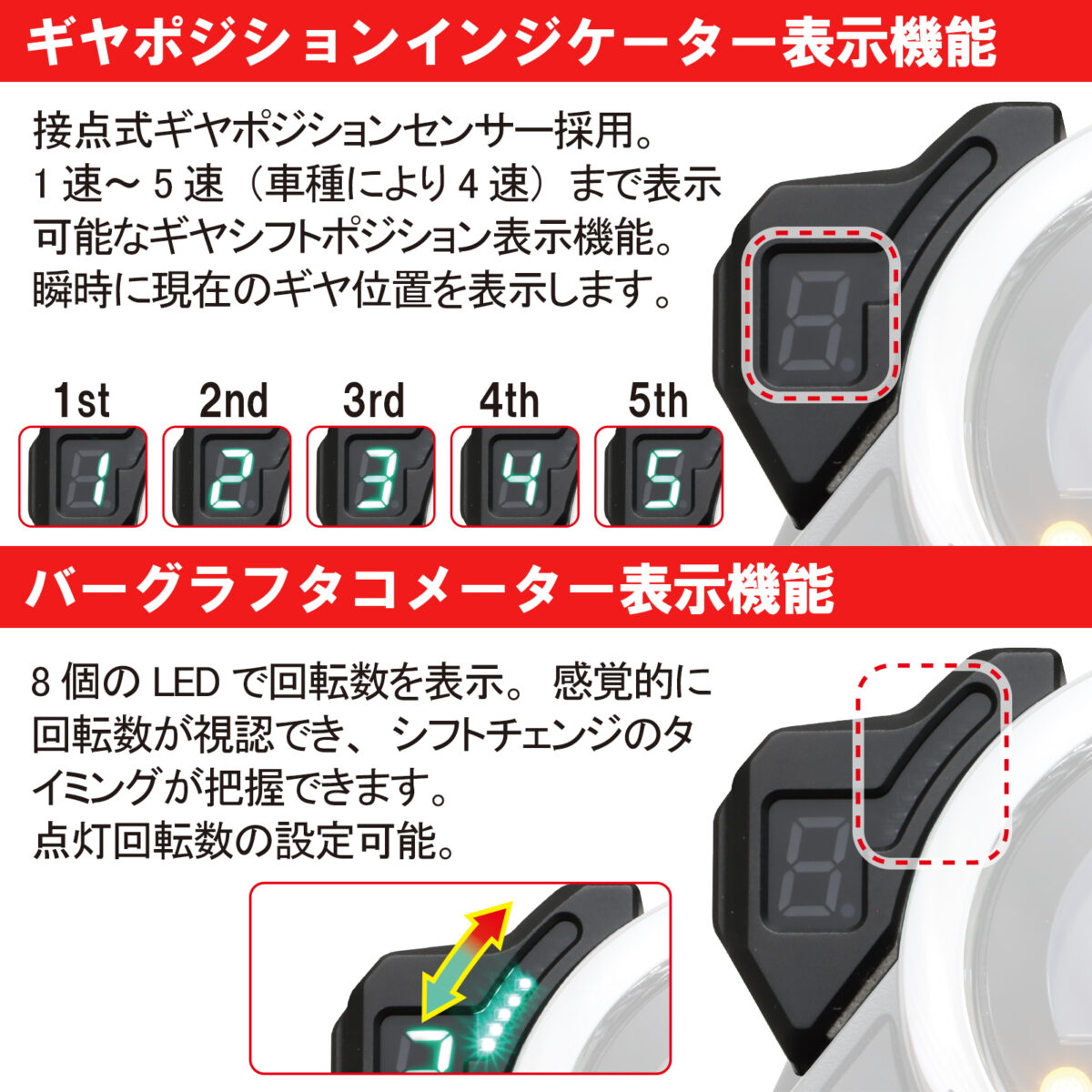 同製品は、現在のギア位置とエンジンの回転数を視覚的に表示してくれる多機能インジケーターとなる。純正のスピードメーターに違和感なく装着できるデザインに、カプラーオンで装着でき、ハーネス加工が必要ないのも特徴だ。運転操作の正確さと安全性を向上する同製品を取り付けて、より快適なバイクライフを楽しんでみてはいかがだろうか。