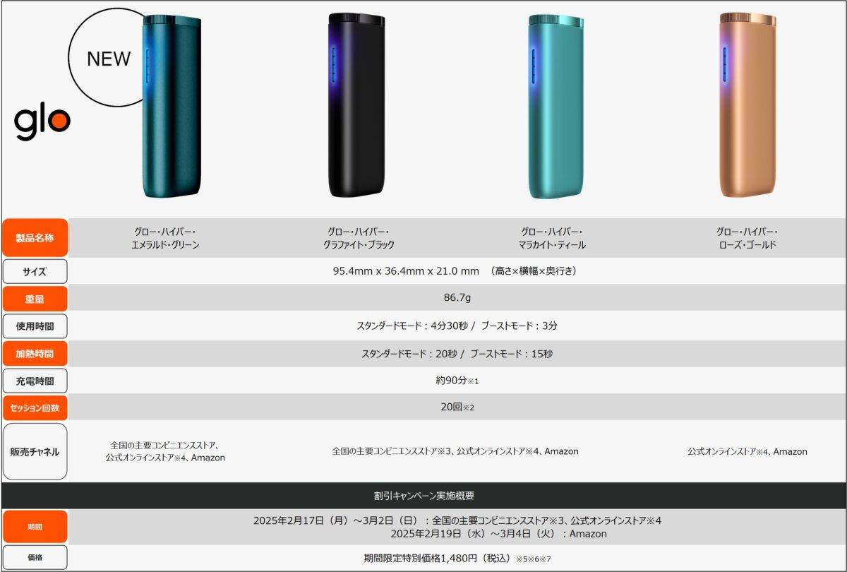 これまでglo™最新デバイスへの乗り換えになかなか踏み切れなかった喫煙者の方々にも、よりお求めやすい価格でお試しいただけるように、2月17日(月)より、「glo™ HYPER」の期間限定割引キャンペーンを全国で順次実施いたします。新カラー「エメラルドグリーン」を含む発売中の「glo™ HYPER」全4カラーにおいて、全国の主要コンビニエンスストア(※1)、公式オンラインストア(※2)では2月17日(月)から3月2日(日)までの期間、Amazonでは2月19日(水)から3月4日(火)までの期間、メーカー希望小売価格2,480円(税込)から期間限定の特別価格1,480円(税込)(※6)(※7)(※8)で販売します。