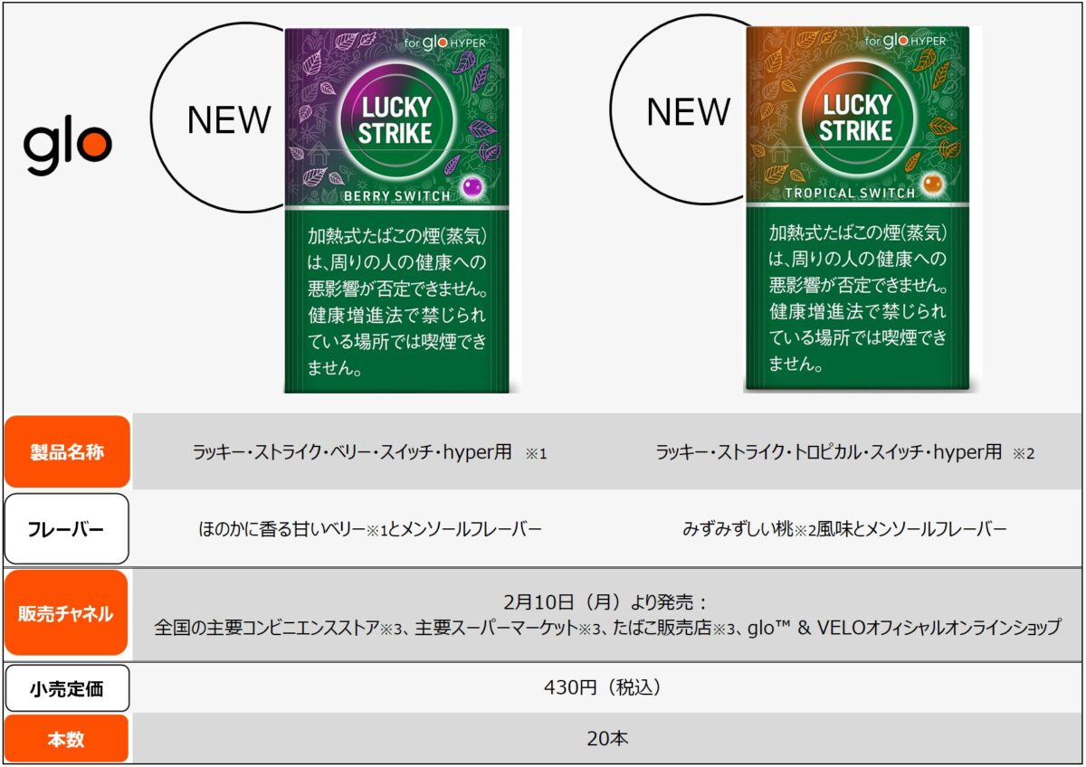 たばこ本来の伝統的な味わいを特長とし、1871年の誕生以来、150年以上にわたって多くのお客様に愛されてきた「ラッキー・ストライク」。2021年からは加熱式たばこglo™ HYPER専用のスティックシリーズとしても展開し、その奥深い風味を引き継いできました。この度、glo™ HYPER用「ラッキー・ストライク」シリーズから、スイッチフレーバーを採用した「ラッキー・ストライク・ベリー・スイッチ・hyper用」と「ラッキー・ストライク・トロピカル・スイッチ・hyper用」を全国の主要コンビニエンスストア(※1)、主要スーパーマーケット(※1)、たばこ取扱店(※1)、glo™ & VELOオフィシャルオンラインショップにて2025年2月10日(月)から発売します。