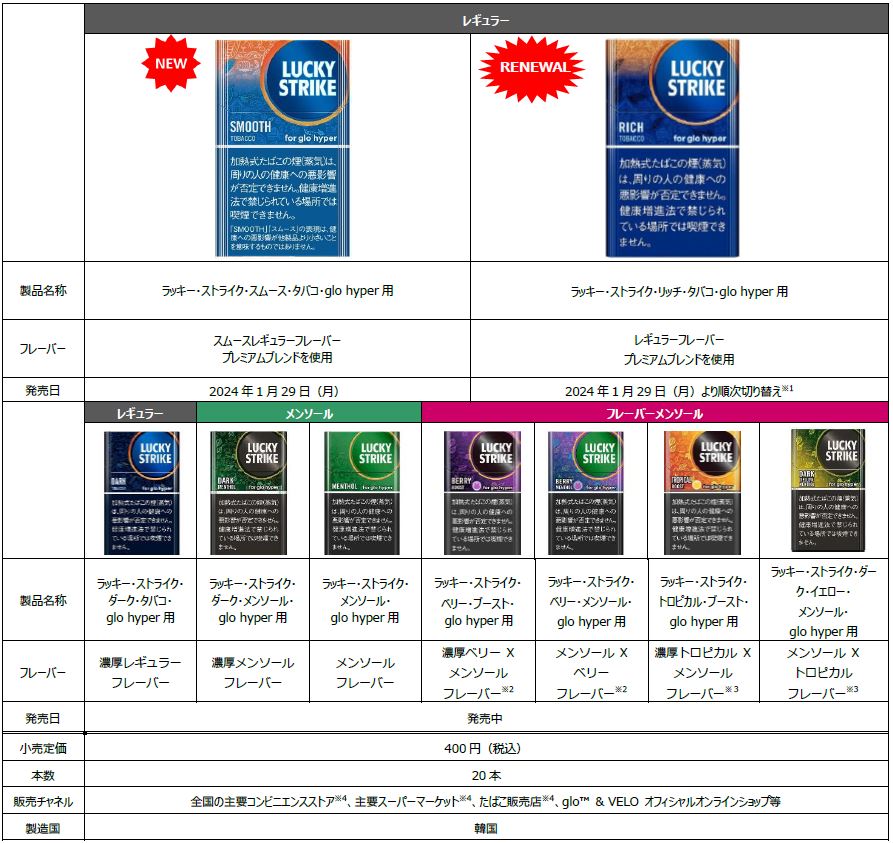 ブリティッシュ・アメリカン・タバコ・ジャパン合同会社は、加熱式たばこ「glo™(グロー)」専用たばこスティックとして、厳選たばこ葉を使用した新レギュラーブレンド銘柄「ラッキー・ストライク・スムース・タバコ・glo hyper 用」を新発売する。また、定番レギュラー銘柄「ラッキー・ストライク・リッチ・タバコ・glo hyper 用」も新ブレンドを採用し、順次リニューアルすると発表した。