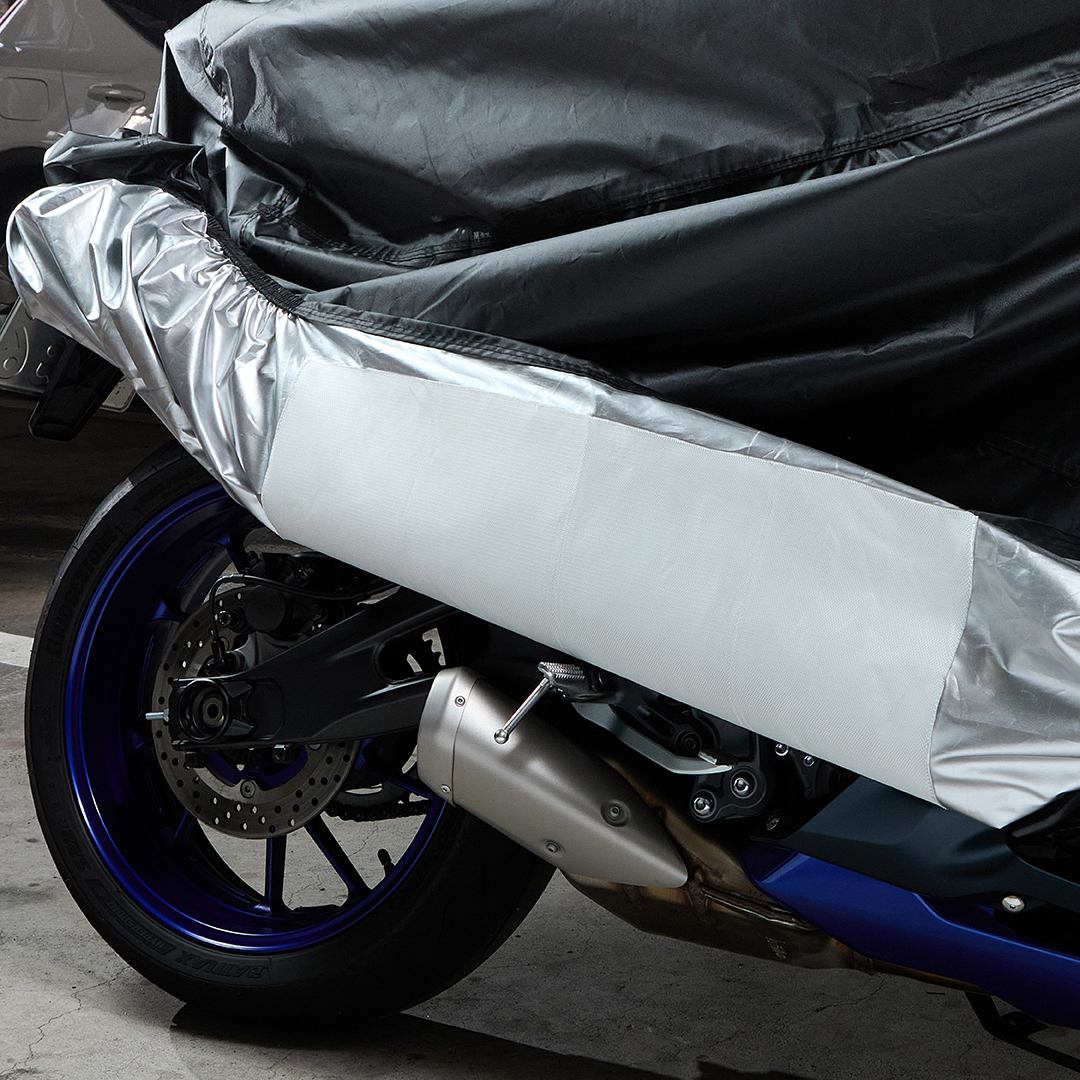 同製品は、厚手で耐久性に優れた「420Dポリエステル」を採用し、耐水圧は大雨を凌ぐ基準値の10,000mmと高い耐久・耐水性を発揮するのが特徴だ。また、全長約220cmまでのバイクに対応しているうえ、マフラーなど高温部分が接触する部位に貼り付け可能な耐熱シートも付属しており、利便性にも優れている。価格は3,980円(税込)。
