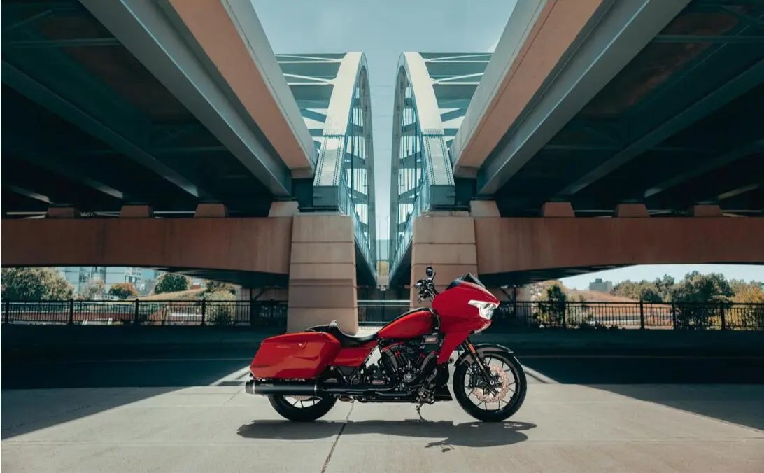 「CVO ロードグライド ST」(写真上)は、King of the Baggers選手権に参戦するScreamin’ Eagle® ファクトリーチームの「ロードグライド」にインスパイアされたモデルで、独自の Milwaukee-Eight® 121 H.O.エンジンと高性能コンポーネントの数々を組み合わせています。深めのソロシートと 6 インチのライザー、モト ハンドルバーの組み合わせにより、ライダーはアグレッシブでアップライトなポジションをとってアメリカ西海岸のカスタムスタイルを体現しており、速く、洗練された最高峰のプレミアムバガーに仕上がりました。