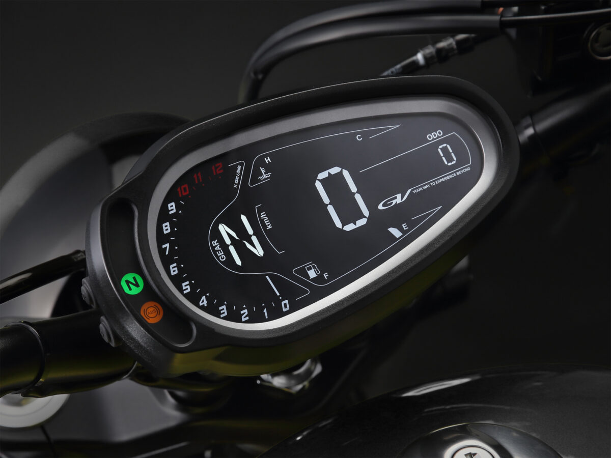 フル液晶メーターには、アナログ調タコメーターやギアポジションが見易くレイアウトされ、輝度調整機能と USB 給電ソケットも備えています。