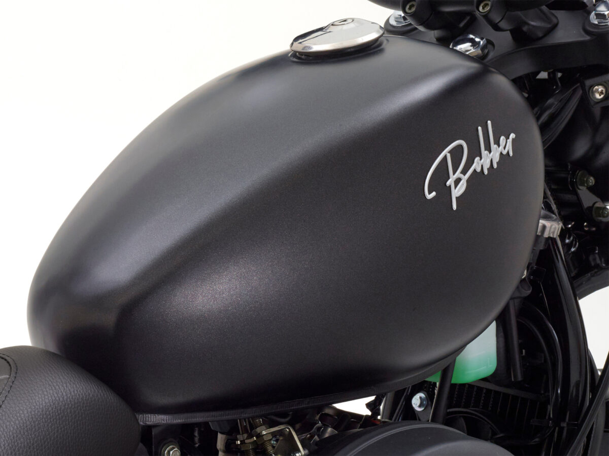 ロー&ロングなボバースタイルを際立たせるティアドロップタンク。スリムな形状ながらツーリングにも安心の 12.5L の容量を備えています。