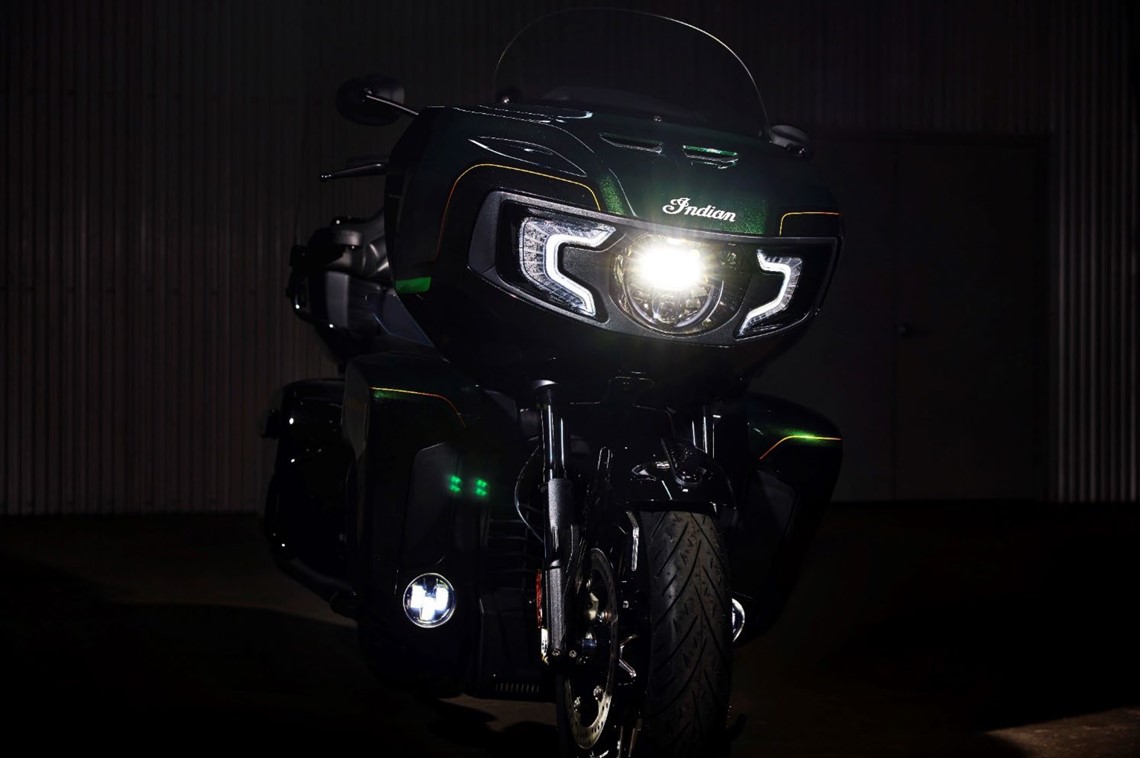 インディアン チャレンジャー エリートは、1920年にインディアンパワープラスで陸上速度記録を樹立し、「人類最速の男」と称されたジーン「アラバマ・フラッシュ」ウォーカーの遺産からデザインのインスピレーションを得ています。クリスタル・ホワイト・パール・サテンの上にプレミアム・ブラック・キャンディとレッド・キャンディを配した3トーンペイントのインディアン チャレンジャー エリートは、ペイントにガラス粒子を含めることで、輝きと深みを増しています。この多層ペイントは、手描きのフェードの上にインディアンモーターサイクルのヘッドドレスロゴパターンで仕上げられています。この印象的なペイントは、プレミアムブラックのダークホースフィニッシュと組み合わされ、この限定バガーに大胆、且つ、レースからインスパイアされたスタイルを与え、人々を振り返らせます。