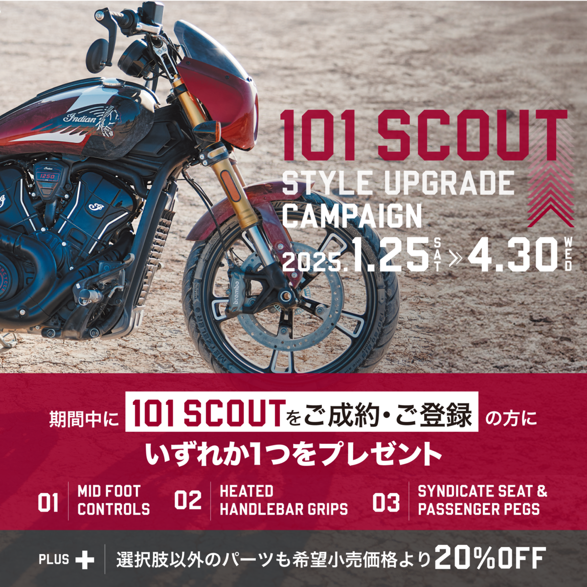 INDIANおよびINDIAN MOTORCYCLEはIndian Motorcycle International, LLCの登録商標です。 ライダーとパッセンジャーは常に安全に配慮したヘルメット、ウェア、アイウェアなどのライディングギアを正しく着用してください。法規に沿った安全運転を心がけてください。事前に車両の取扱説明書を読み、理解してください。