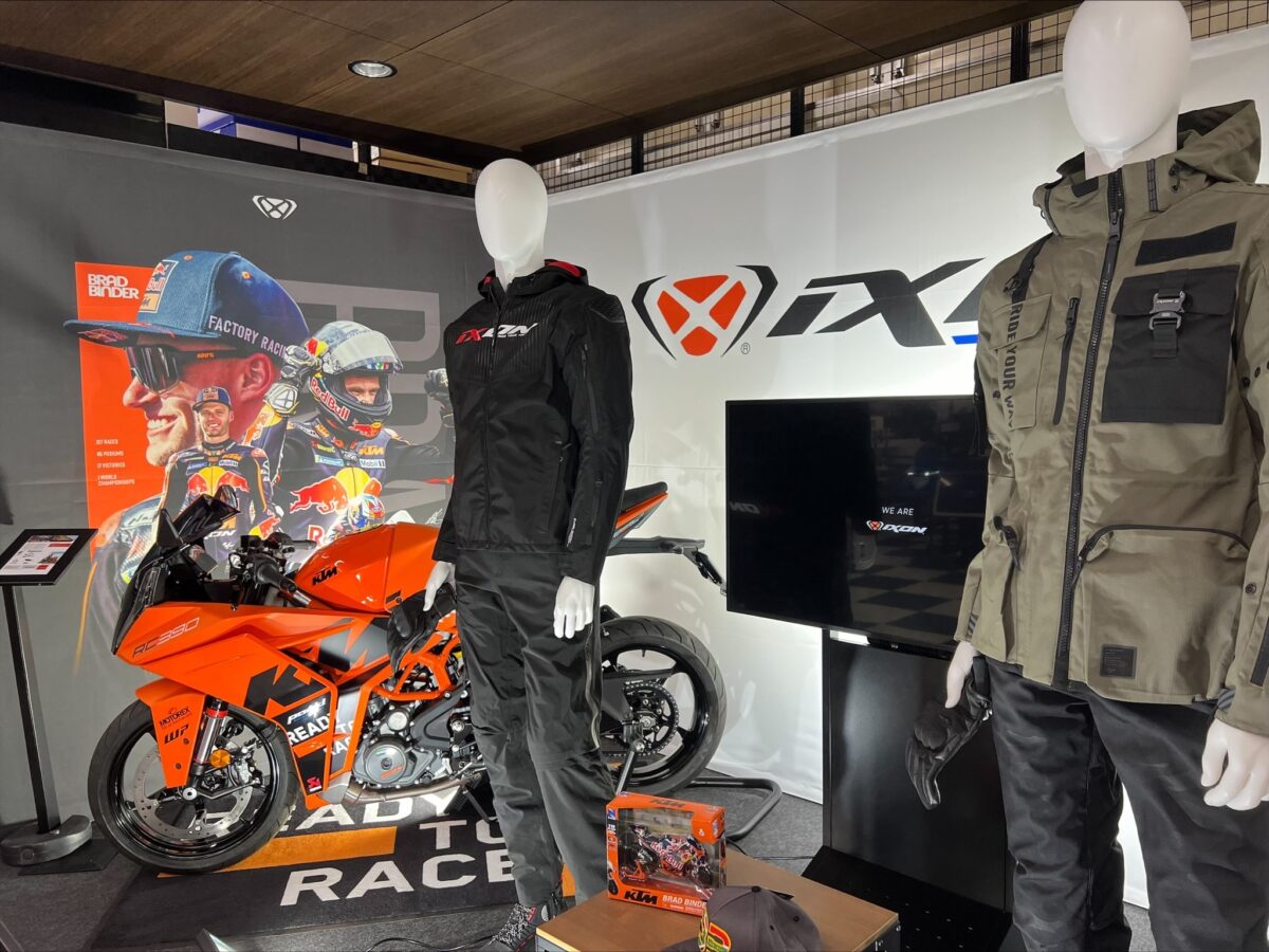 フランスのバイク用アパレルブランド『IXON(イクソン)』を手掛ける ACCESS EQUIP MOTOS FRANCE SAS(本社:フランス、代表:Thierry Maniguet)は、ライコランド東雲店(東京都)の入口に KTM Japan 協力のもとで、特設ステージを設置。フランスの IXONブランド製品と共に、KTM RC 390 GP 車両展示と、そのレーシングイメージに合わせたMotoGP の KTM ファクトリーライダーであるブラッド・ビンダー選手のレーシングスーツやアパレルを展示。