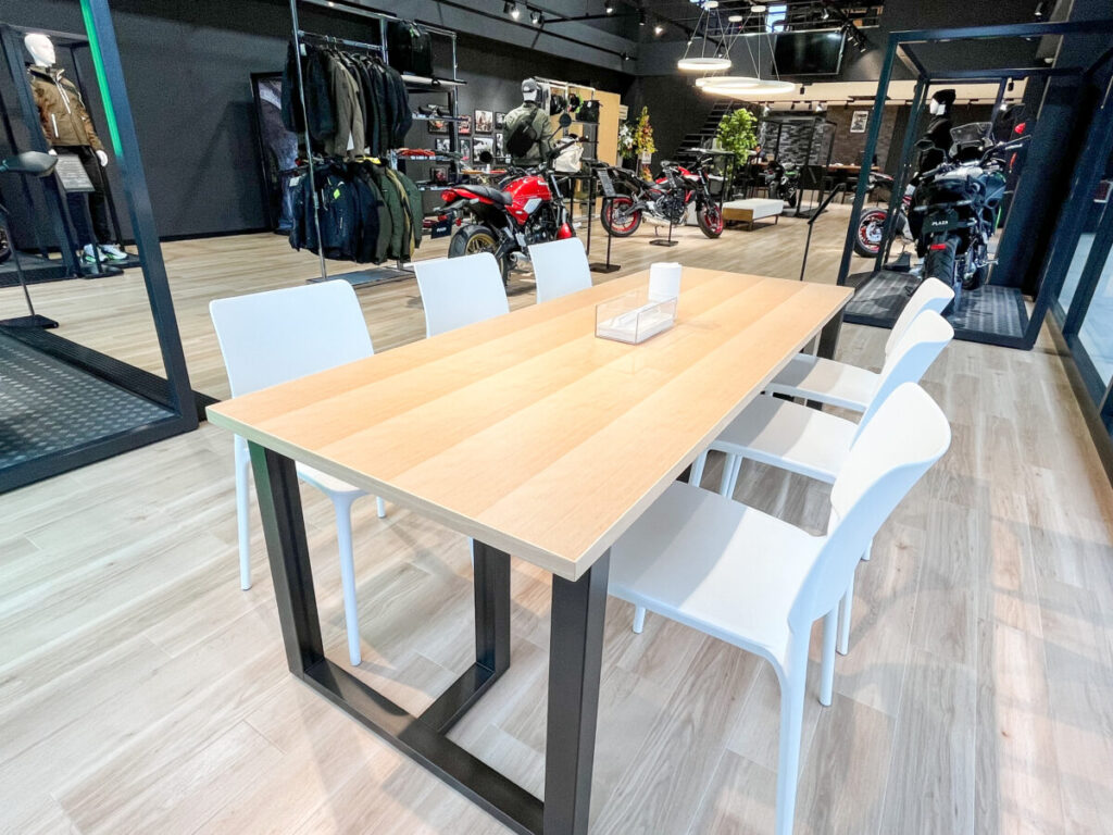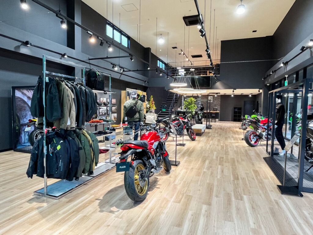 優しい明るさの店内。モーターサイクルとプラザアパレルがゆったりと展示され、どなたでも楽しめる空間としています。
