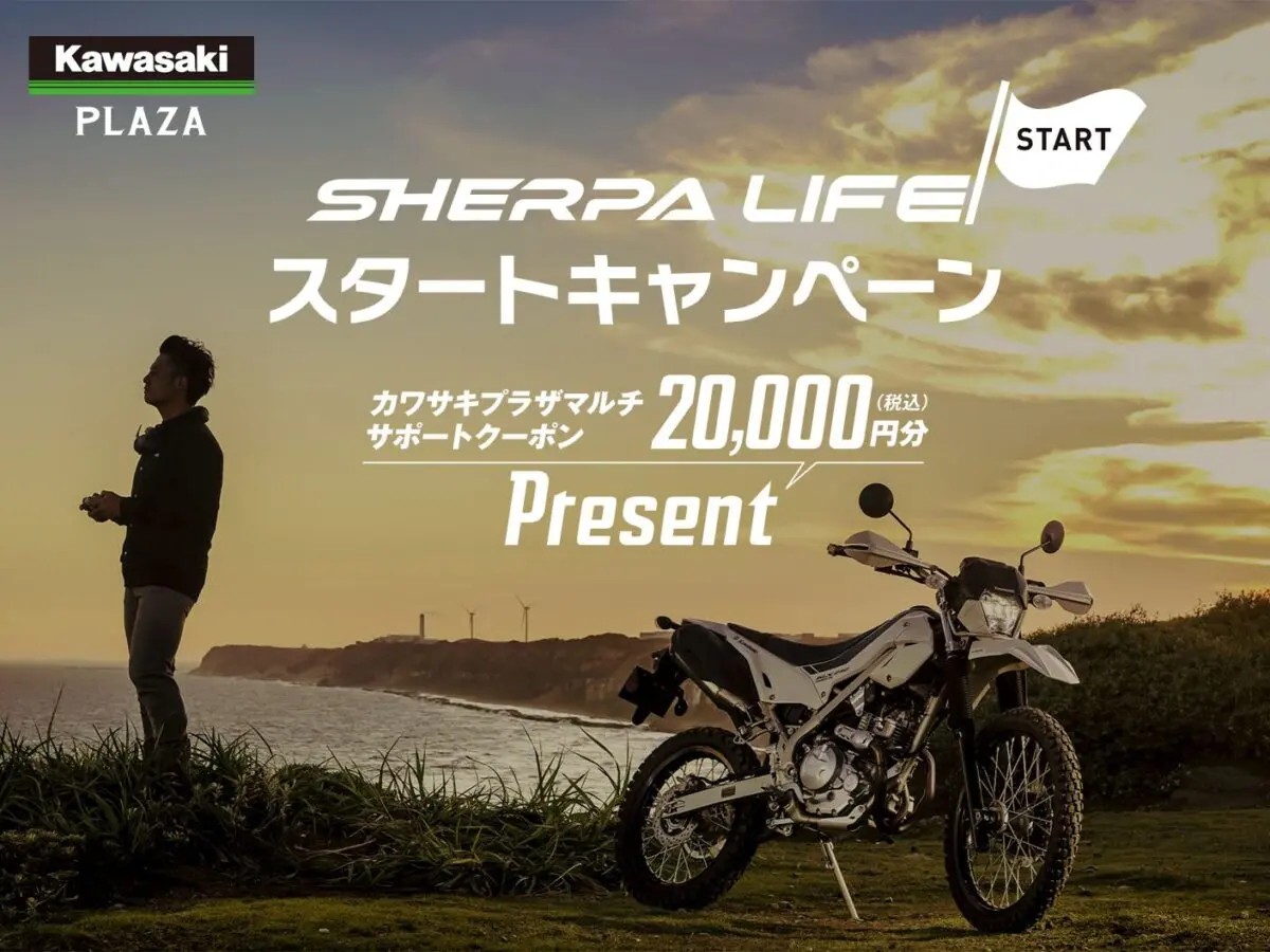 株式会社カワサキモータースジャパン(本社:兵庫県明石市、代表取締役社長:佐伯 健児)が展開するカワサキプラザネットワークでは、全国のカワサキプラザで”KLX230 SHERPA”の新車をご成約いただいた方に、2万円分の購入サポートクーポンをプレゼントする「SHERPA LIFE スタートキャンペーン」を実施中です。