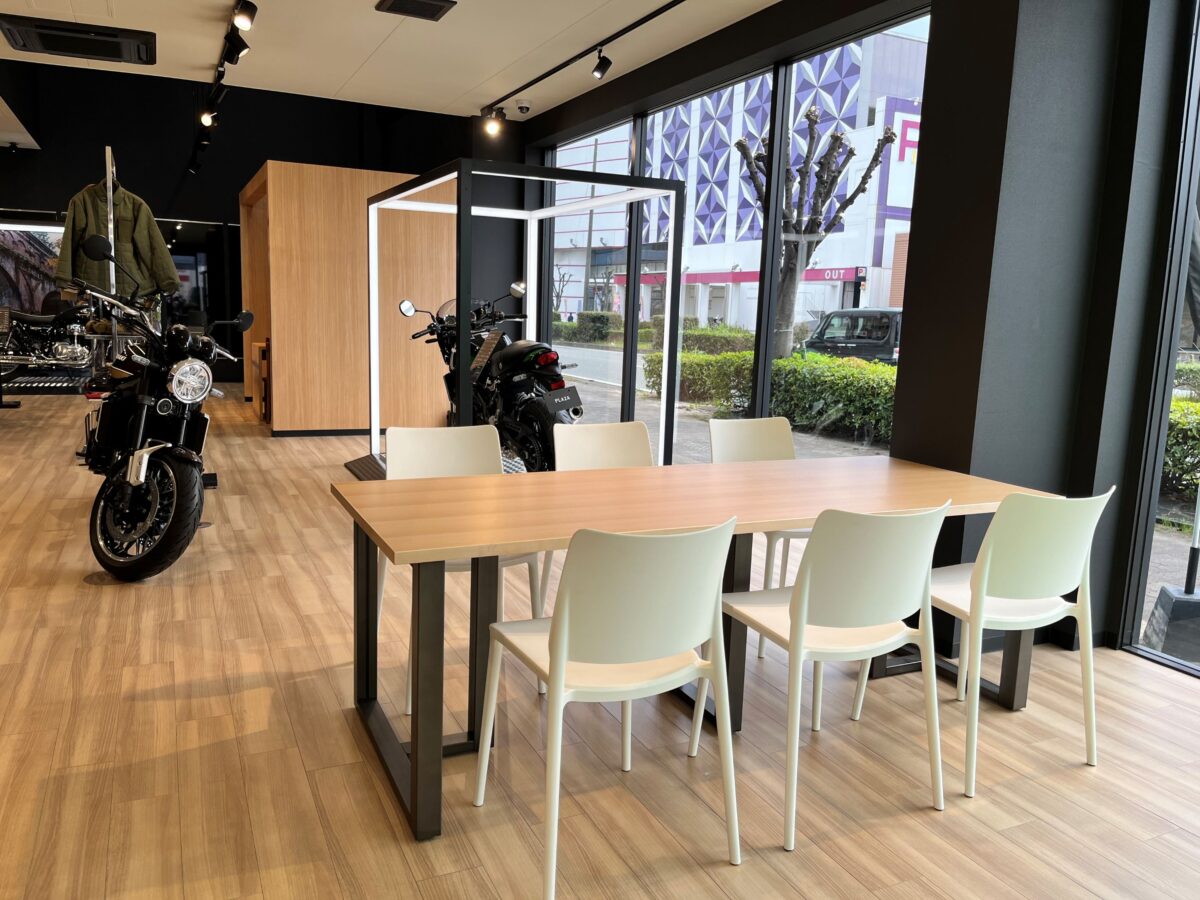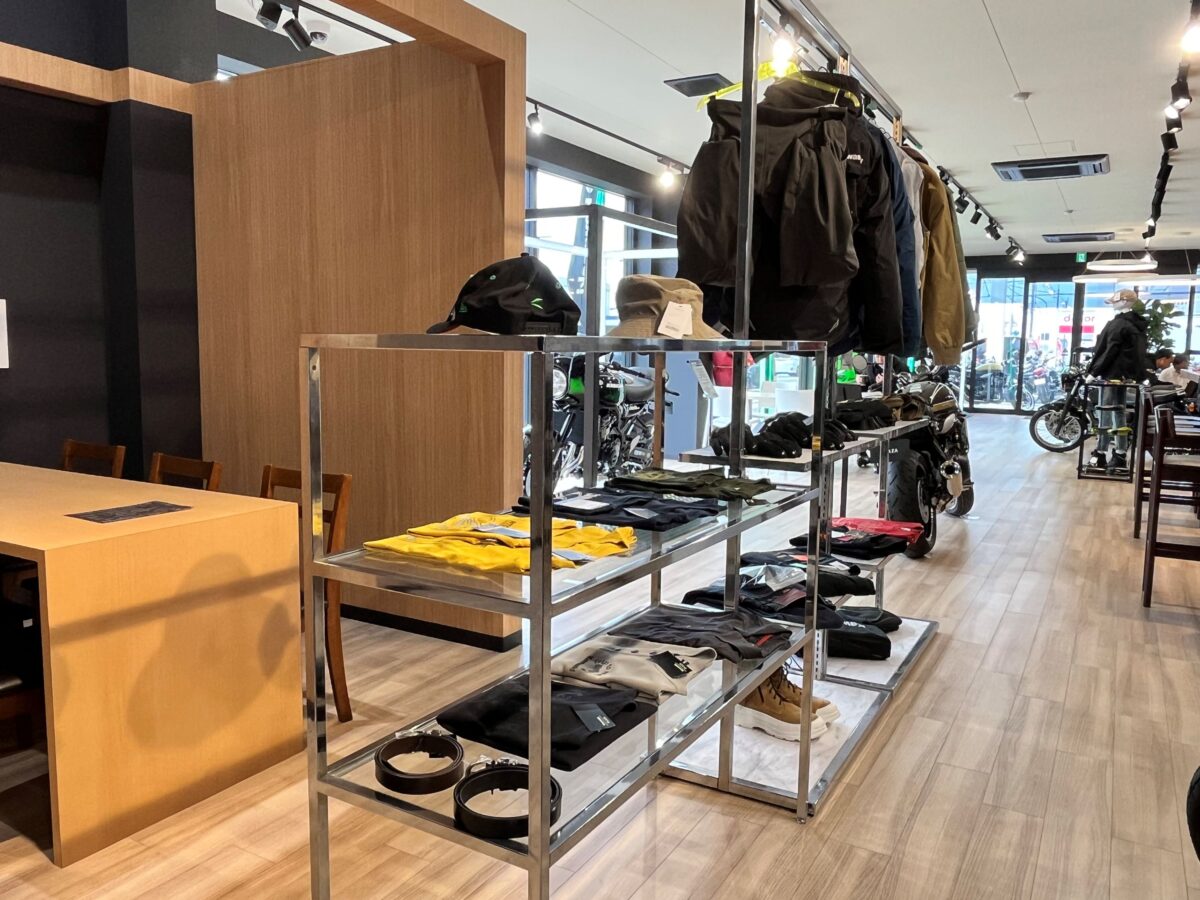 木目調のフロアと白い天井が織りなす明るい店内。モーターサイクルとプラザアパレルがゆったりと展示され、どなたでも楽しめる空間としています。