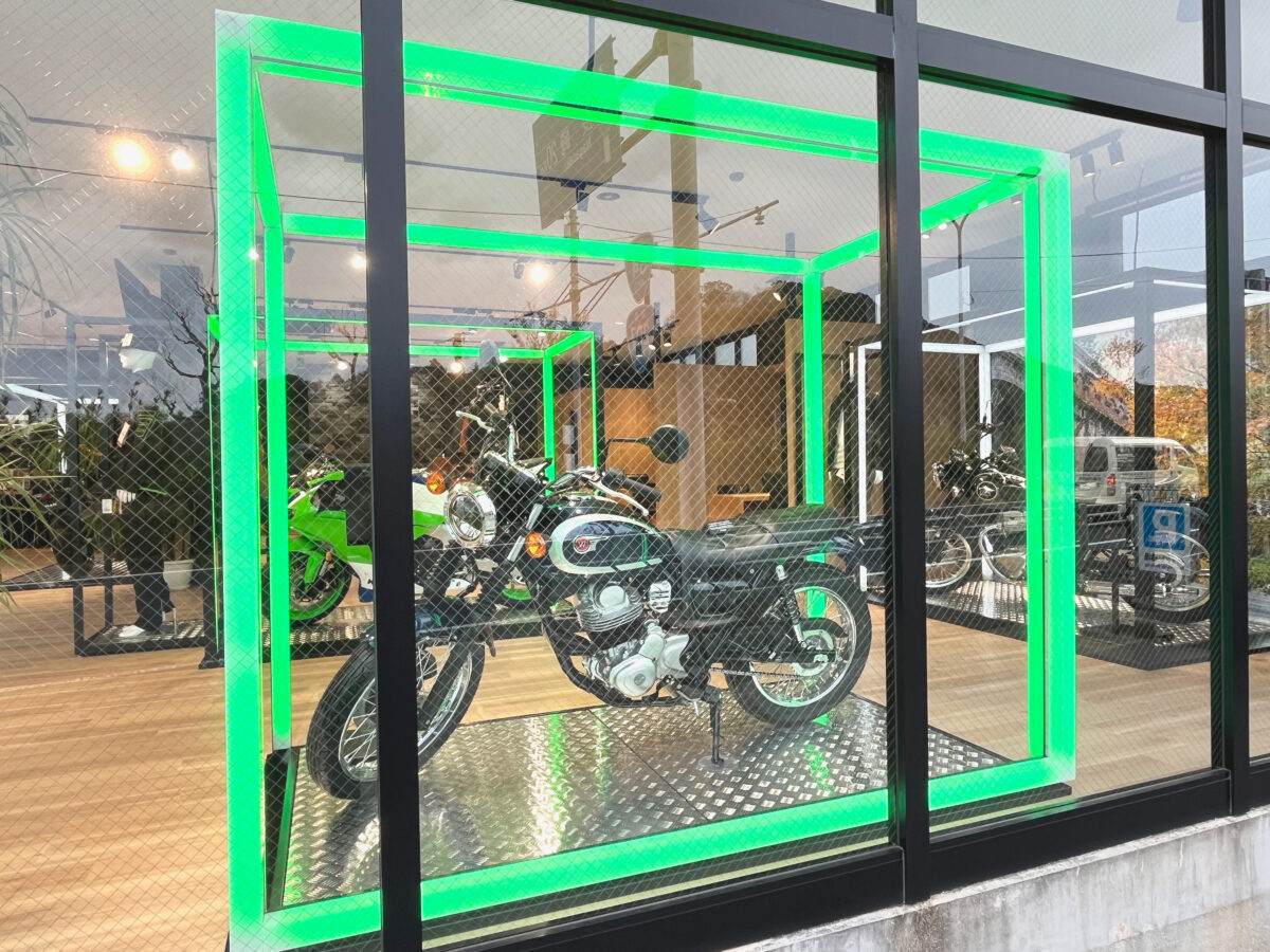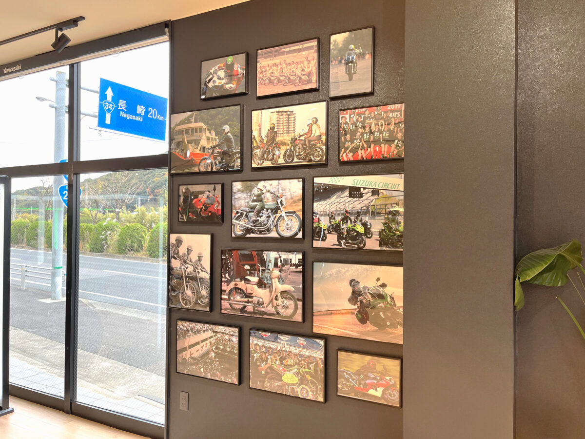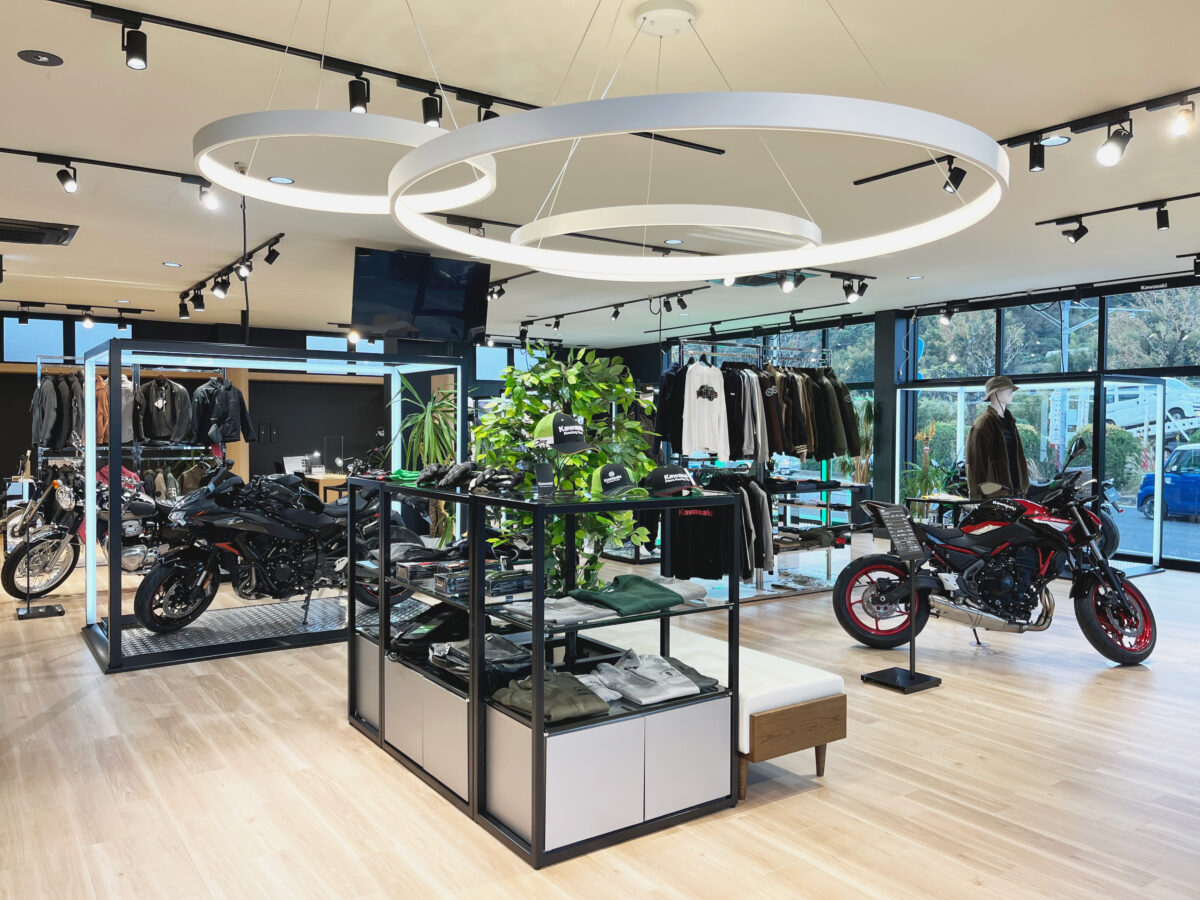 同店舗は、長崎自動車道、諫早ICより国道34号線を多良見・長崎市内方面へ約2km行ったところにあり、敷地内に四輪駐車場も完備しているため、アクセスも良好だ。木目調のフロアと白い天井が織りなす明るい店内に、カワサキ プラザのアイコニックポイント、「光の枠」が「光のケージ」に進化しているのが特徴だ。お近くの方は足を運んでみてはいかがだろうか。