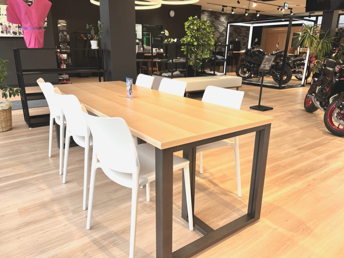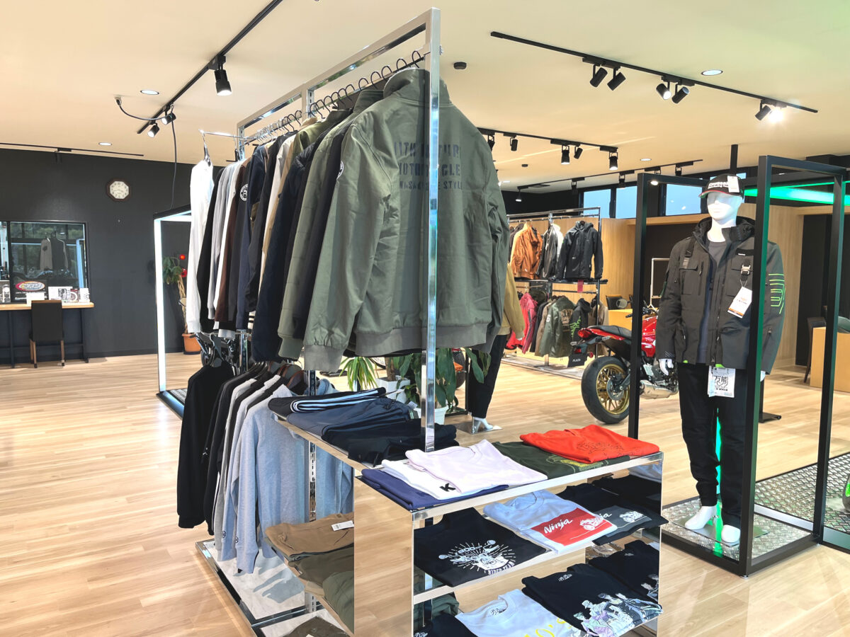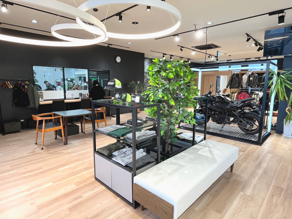 木目調のフロアと白い天井が織りなす明るい店内。モーターサイクルとプラザアパレルがゆったりと展示され、どなたでも楽しめる空間としています。