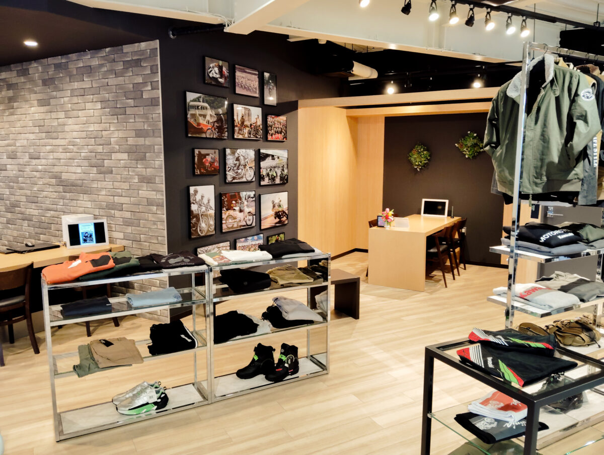 木目調のフロアと白い天井が織りなす明るい店内。モーターサイクルとプラザアパレルがゆったりと展示され、どなたでも楽しめる空間となっています。