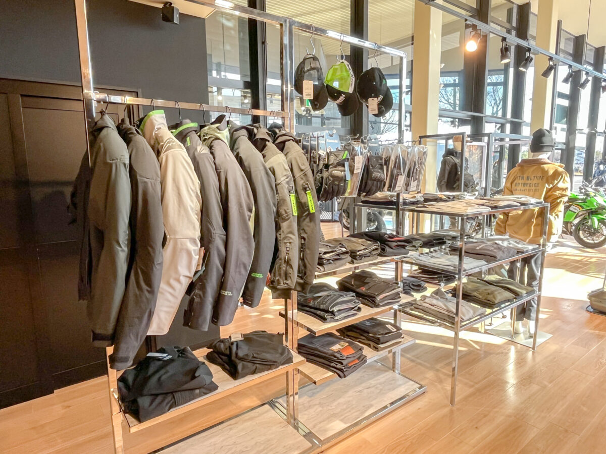 木目調のフロアと白い天井が織りなす明るい店内。モーターサイクルとプラザアパレルがゆったりと展示され、どなたでも楽しめる空間としています。