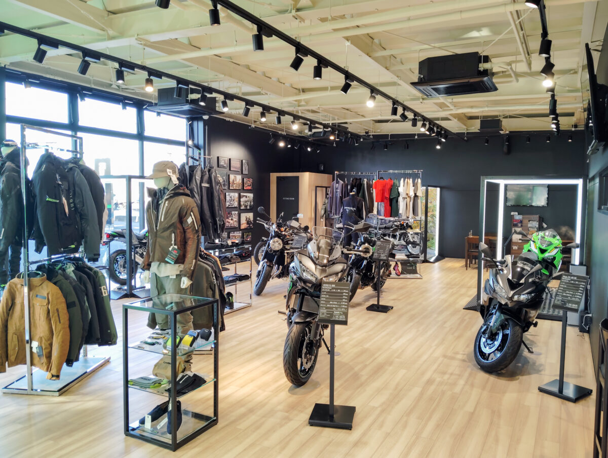 木目調のフロアと白い天井が織りなす明るい店内。モーターサイクルとプラザアパレルがゆったりと展示され、どなたでも楽しめる空間となっています。