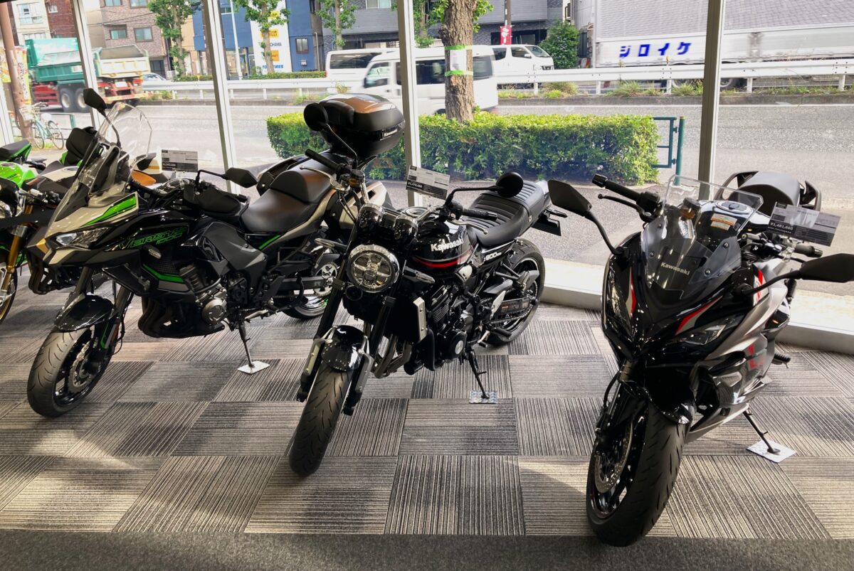 ・ショールームでは、良質な認定中古車を数多く展示。ゆったりとした展示により、カワサキモーターサイクルのプロフェッショナルが厳選した一品ものの車両をじっくりとご覧いただけます。