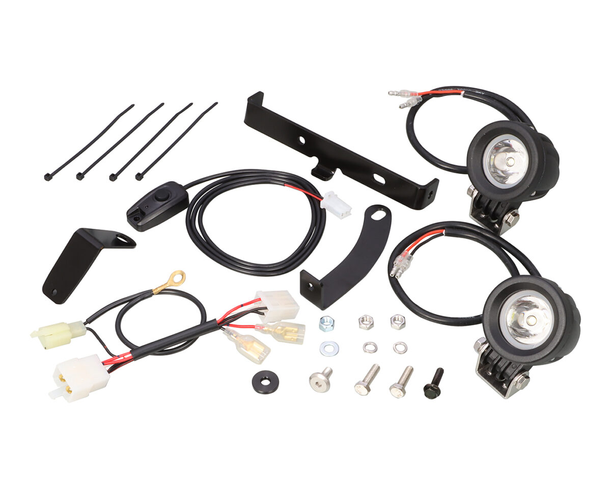 備 考:●ボルトオン ●LEDシャトルビーム× 2 灯 ●ステー:スチール製ブラック●ヘッドライトステー下部取付タイプ ●電源取り出しハーネス、ワッシャ、ボルト、ナット類付属 ●電源ON/OFFスイッチ付属 ●結束バンド付属