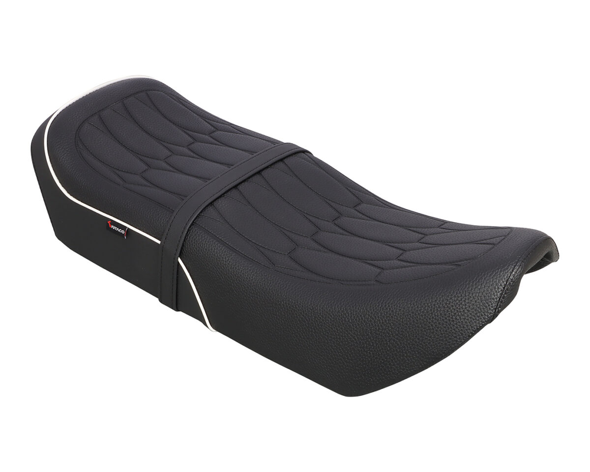 カスタムスタイルを崩さないシート形状。プレーンな段付きスタイルにパイピングを配したダックス125のドレスアップには欠かせないカスタムシートです。