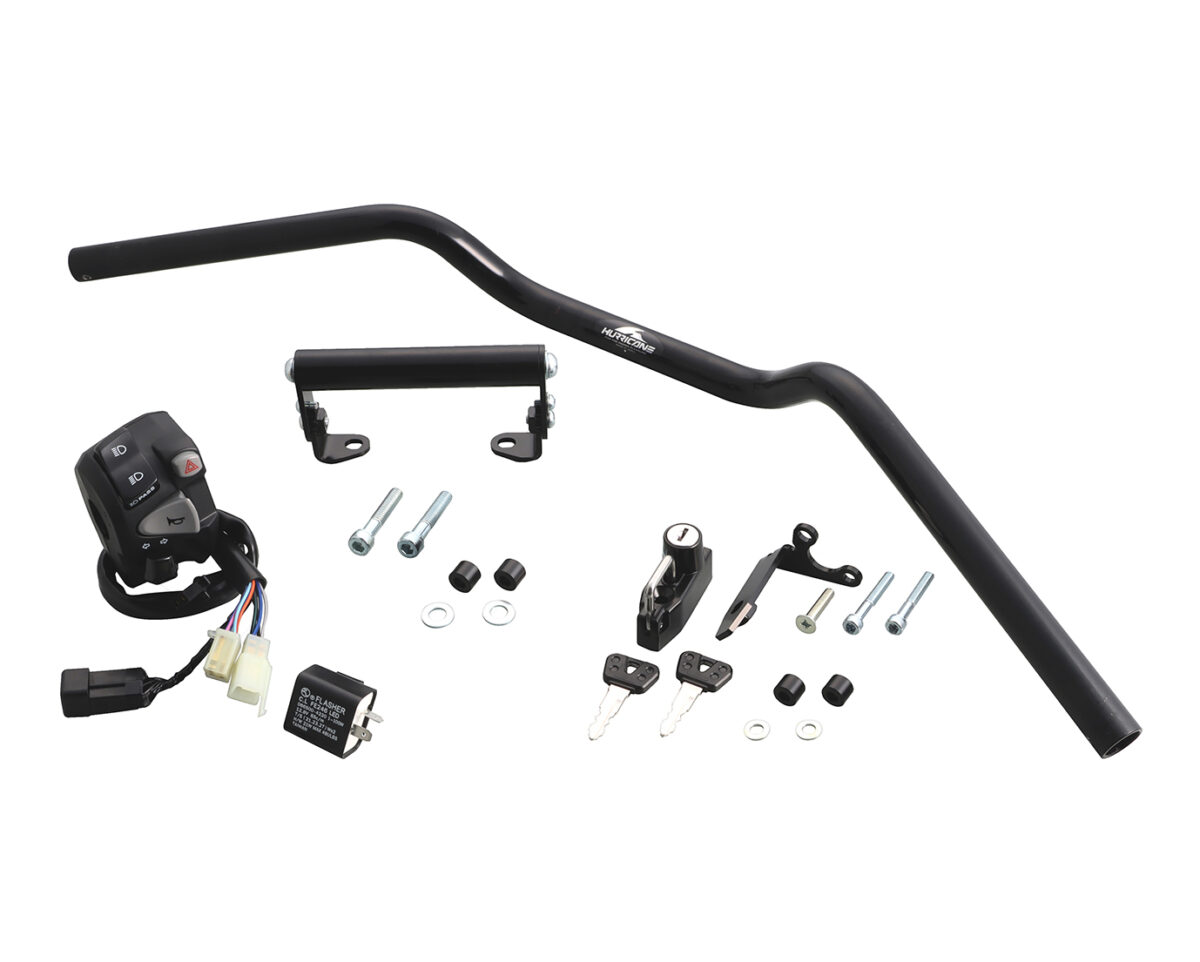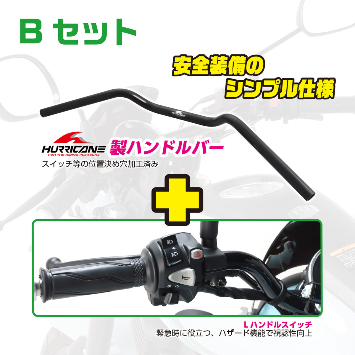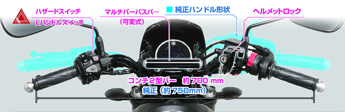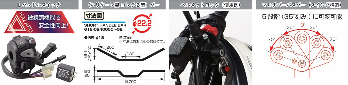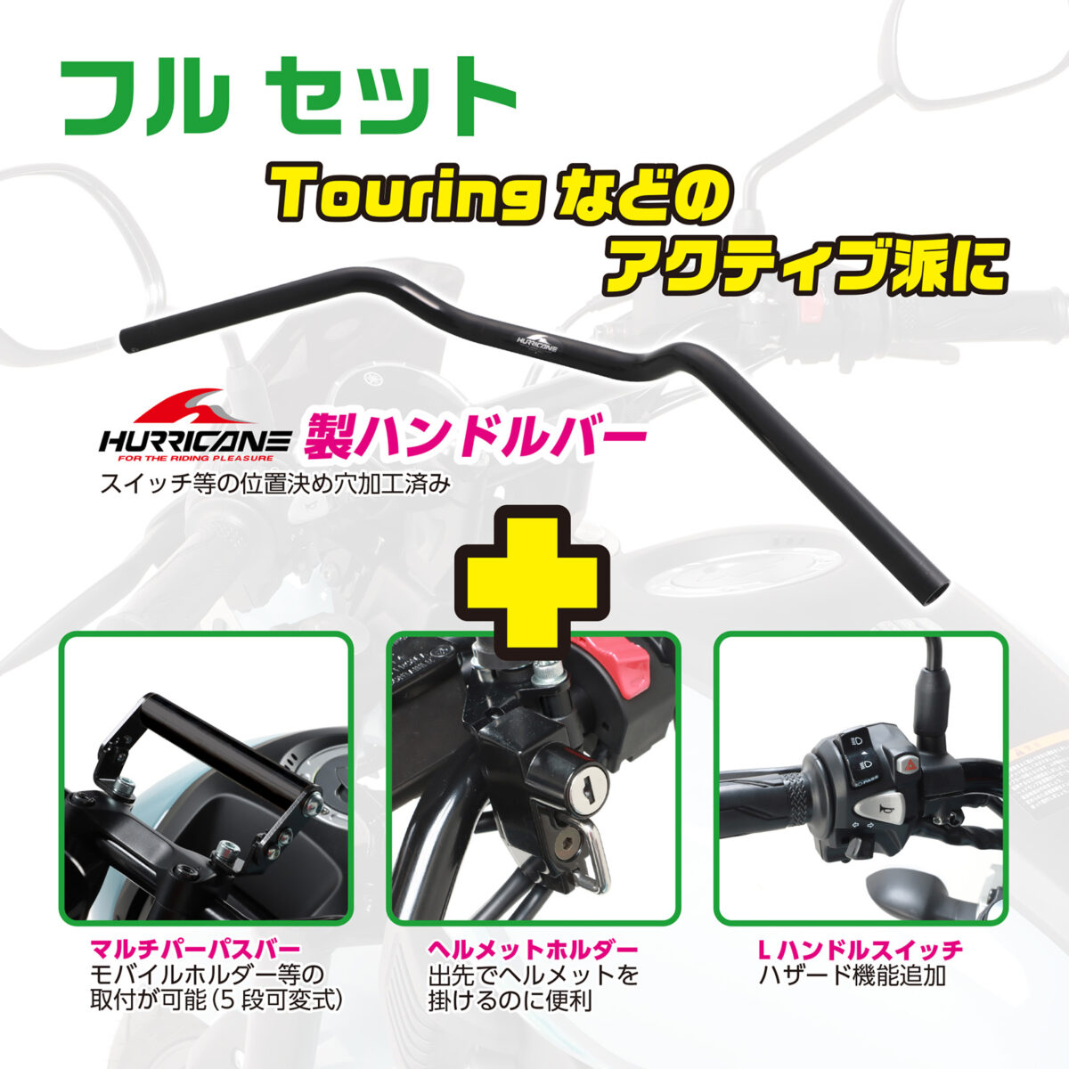 純正ハンドル(幅:約 750mm)に対し、幅約 50mm 縮小、プルバックも変更することで、より上半身が起き上がり視界が広がった乗車姿勢で通勤などからツーリングまで幅広く対応。標準装備にない緊急時に役立つ、ハザード機能を備えたハンドルスイッチを装備。またツーリングや、街乗りに便利なマルチパーパスバー(可変式)とヘルメットロックを付属。用途に合わせて選べる3タイプ。