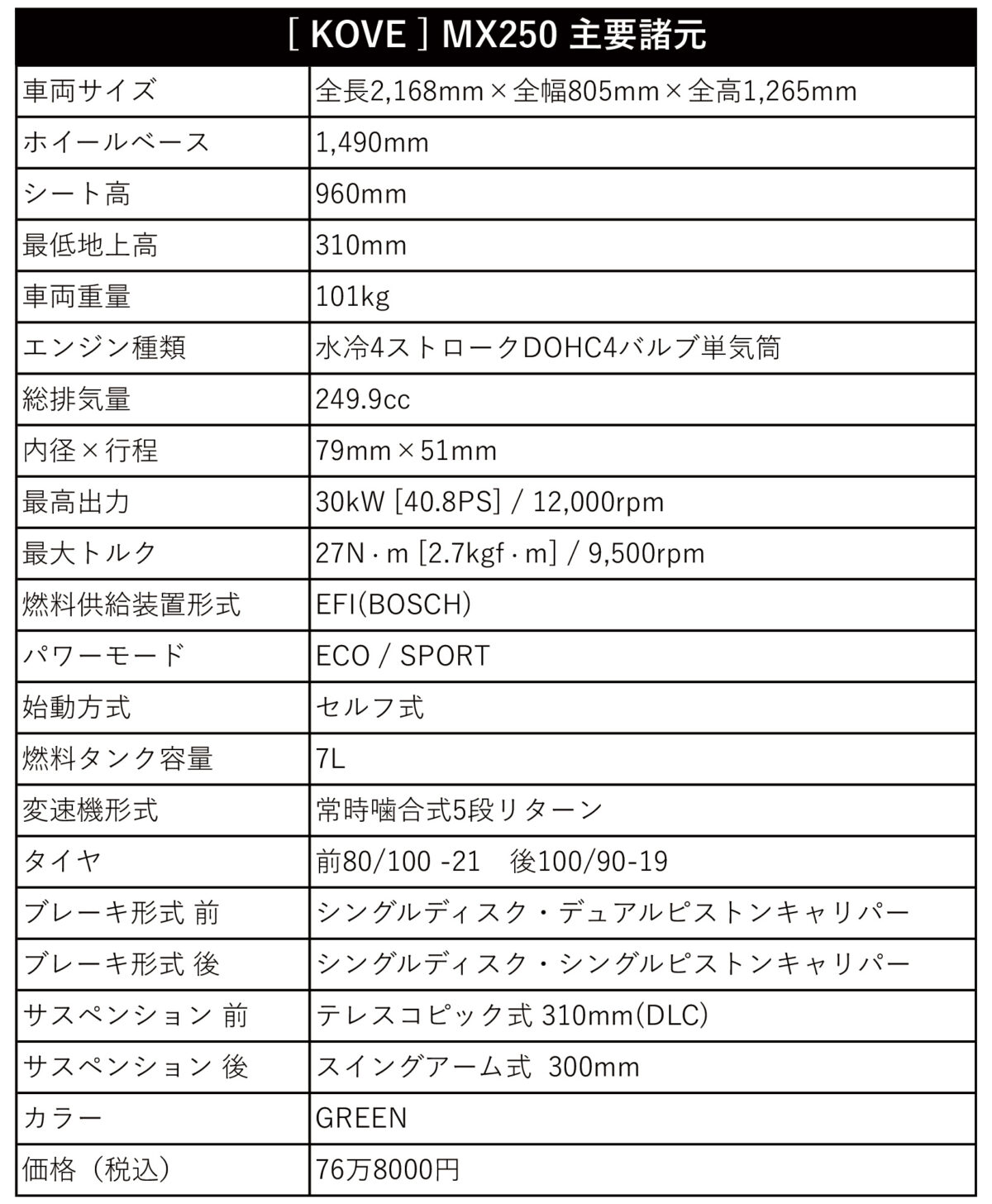KOVEのモトクロッサーMX250がGEN2(第二世代)に進化。エンジンを完全刷新し40.8PSのパワーを獲得。101kgの軽量コンパクトな車体は日本人にも適している。フロントフォークインナーチューブにDLCコーティングを施し作動性を向上。また、MX250をベースにエンデューロレーサー MX250/350Enduro、ラリーマシン 250/350RALLYの開発も進められている(2026年発売予定)。