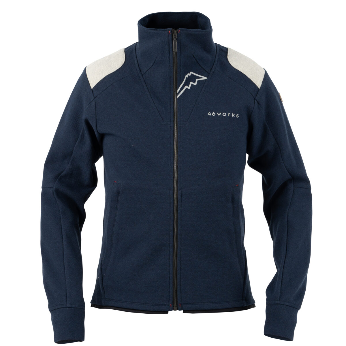 46worksMIDトラックジャケットです。ダイヤ状の凹凸感のある肉厚な綿タッチの素材を独自新開発しました。裏面も凹凸を設け、肌あたりの面積を少なくすることでより良い気心地に貢献します。肩のパテッドデザインステッチをダイヤ柄へデザイン変更しています。
