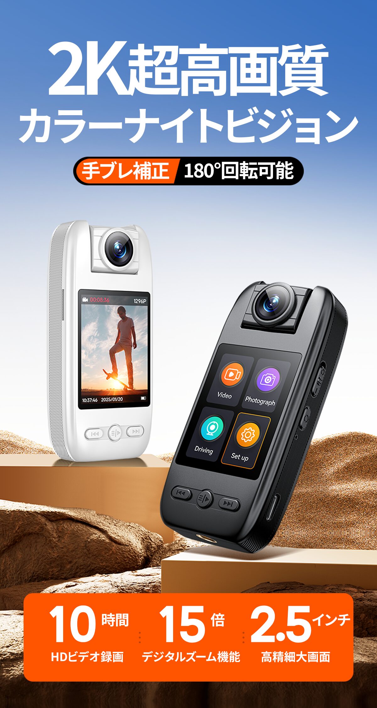 カラーナイトビジョン機能により、夜間でも鮮やかなカラー映像を記録可能。2.5インチ IPSディスプレイで映像をその場で確認でき、48MP高解像度の写真撮影にも対応。