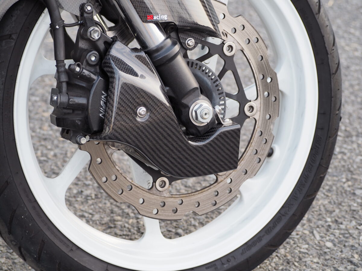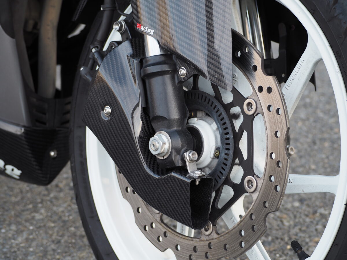 フォークガードを一体形状にすることにより、飛び石などからフロントフォークのインナーチューブを守る。